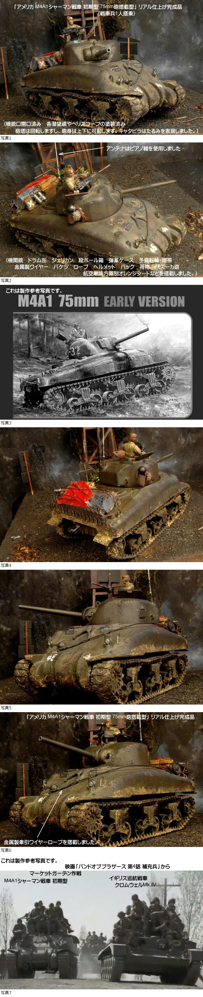 | ■今回の作品もジオラマではなく、単品完成品です。当店委託のプロモデラーが「ヘアスプレーチッピングや汚し塗装等」を施工するなどリアルに製作しており、クオリティは以下の商品説明の画像でも確認して下さいね。(撮影に使用したジオラマ展示台は、商品ではありませんよ。) ① 1/35 「アメリカ M4A1シャーマン戦車 初期型 75mm砲搭載型」 リアル仕上げ完成品 (アンテナはピアノ線を使用しました。金属製牽引ワイヤーロープを搭載しました。機関銃 ドラム缶 ジェリカン 段ボール箱 弾薬ケース 予備転輪・履帯 金属製ワイヤー バケツ ロープ ヘルメット バック 荷物 バズーカ砲 航空敵味方識別オレンジシートなどを搭載しました。)アメリカ戦車兵1人を搭乗させました。 ■緻密で繊細に製作しており、とても精度の高い作品ですが、史実に忠実に表現したわけではありませんよ。(1944年9月頃 オランダ ニューネン近郊でのマーケットガーデン作戦を想定しました。 マーケット・ガーデン作戦では、ニューネン近郊に東部戦線で運用されていたドイツ第9SS装甲師団などが、部隊再編のため一時駐留していたという不運も重なり、イギリス第1空挺師団が壊滅するなど連合軍が敗退しております。) ■ヤフー画像検索で「PP工房完成品」と検索いただければ、当店の最近の作品の画像を見ることができますので、そちらも見ていただければ幸いです。・・・PP工房完成品 ★使用パーツなど(以下の作品がすべて付いてきますよ。) 1 1/35 アスカ M4A1シャーマン戦車 初期型 75mm砲搭載型(機銃口開口済み 各潜望鏡やペリスコープの塗装済み 砲塔は回転しますし、砲身は上下に可動します。キャタピラはたるみを表現しました。)アメリカ戦車兵1人配置しました。 2 金属製ネームプレート板「M4A1シャーマン戦車 75mm砲搭載型」を配置しました。 ■当店(PP工房)では、プラモ完成品を週3回位の割合で出品しておりますので、よろしくおねがいしますね。 | |