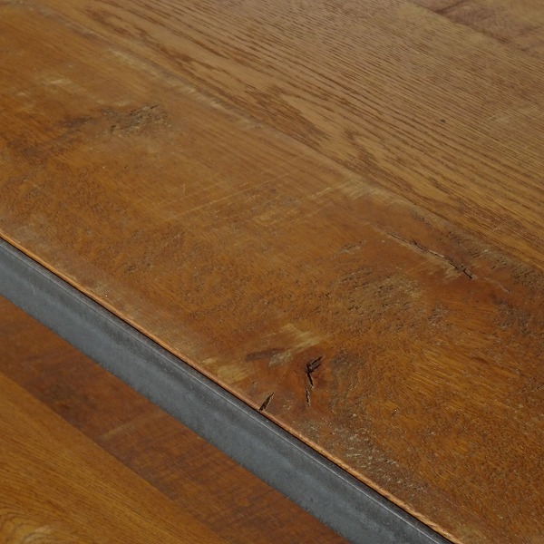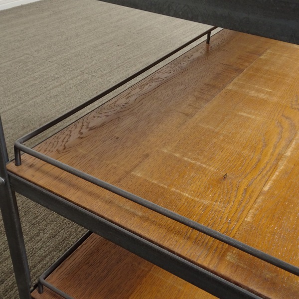 ●Item description:昔の薬局や工場のパーツ収納、図書館のカード入れなどで使われている、引き出しや箱が一面にたくさん並んでいるのが好きで作ったシェルフ。あえて薄くした天板は節、割れ、荒木を生かしたナラ材、細いフレームにしっかりとした太い脚は表面にザラつきのあるスチールなど、素材感から滲み出るよさがあります。