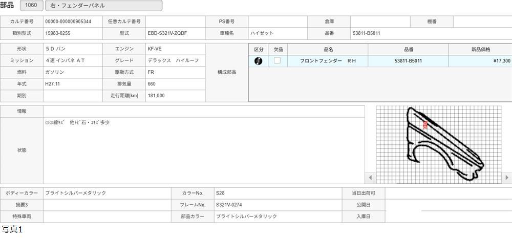 H27年 S321V ハイゼット デラックスハイルーフ カラー:S28 右 フェンダーパネル /送料 SS/905344 收藏