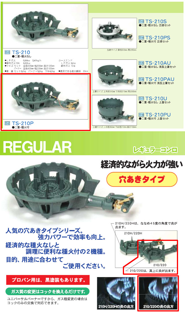 タチバナ製作所 鋳物コンロ TS-210P を出品いたします。 ■特徴■ 経済的ながら火力が強い 穴あきタイプ 穴あきタイプの二重の鋳物コンロで、 真上方向の炎口を持つ、 幅広い用途に対応する スタンダードなモデルです。 ■仕様■