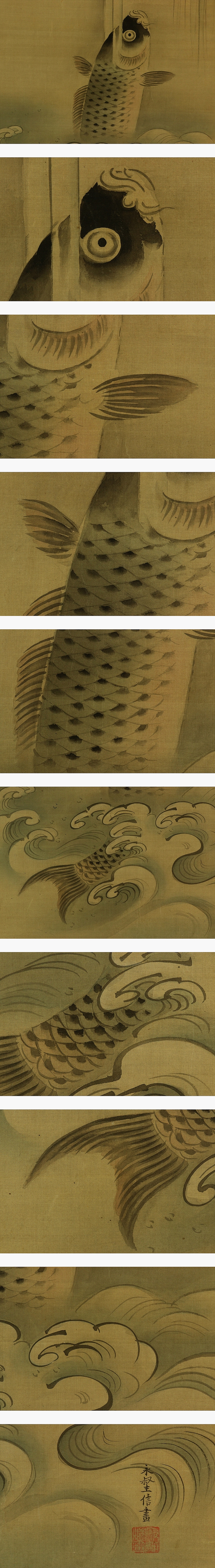 | №2209006 名品【真作】狩野永叔(主信)【鯉瀧登】◆絹本◆合箱◆掛軸 | |