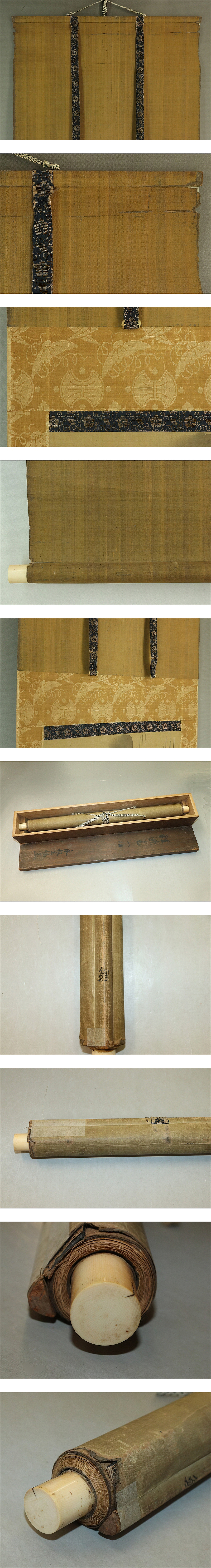 狩野永叔 江戸中期の画家。狩野家九代。時信の男。 幼名は七三郎、名は敏信、のち明信、主信と改める。 法号は瑞翅斎澹然居士。画法を父に学び、祖父安信の画風を受ける。 幕府の絵師となり法眼に叙せられた。享保9年(1724)歿、50才。 本紙は、染み、汚れ、折れ、皺、ヤケ、浮きがあります。 表装は、染み、汚れ、折れ、皺、虫食、破れ、ほつれ、剥がれ、ヤケ、くすみ 軸先に汚れと傷みがあります。 【サイズ】 作品 横約40.5cm×縦約153cm 表装 横約95cm×縦約182cm |
