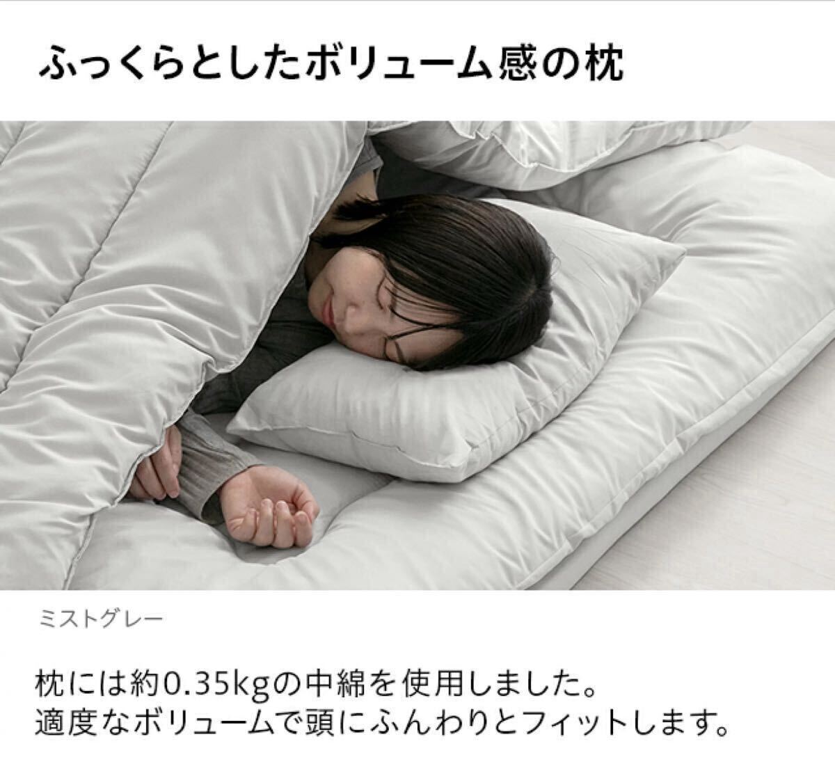 ・まくらは0.35kgのワタ入りで、頭をしっかり支えます