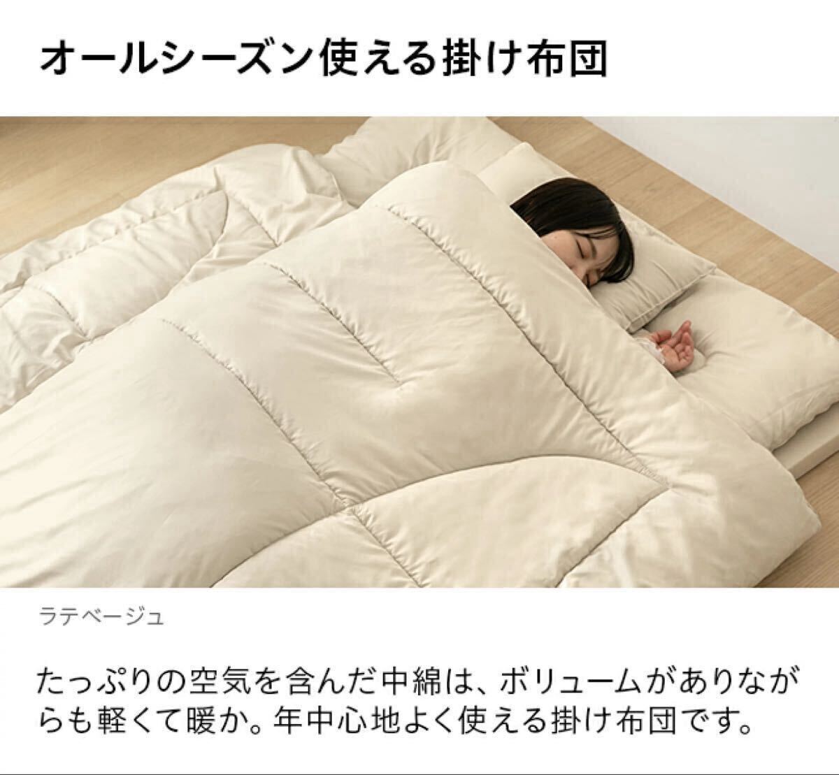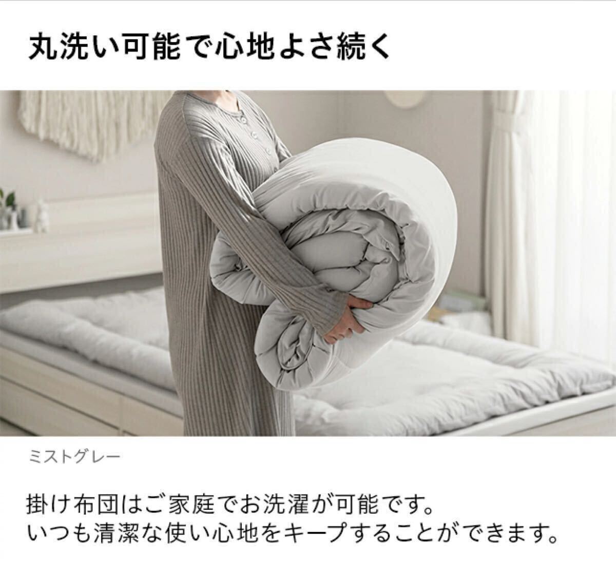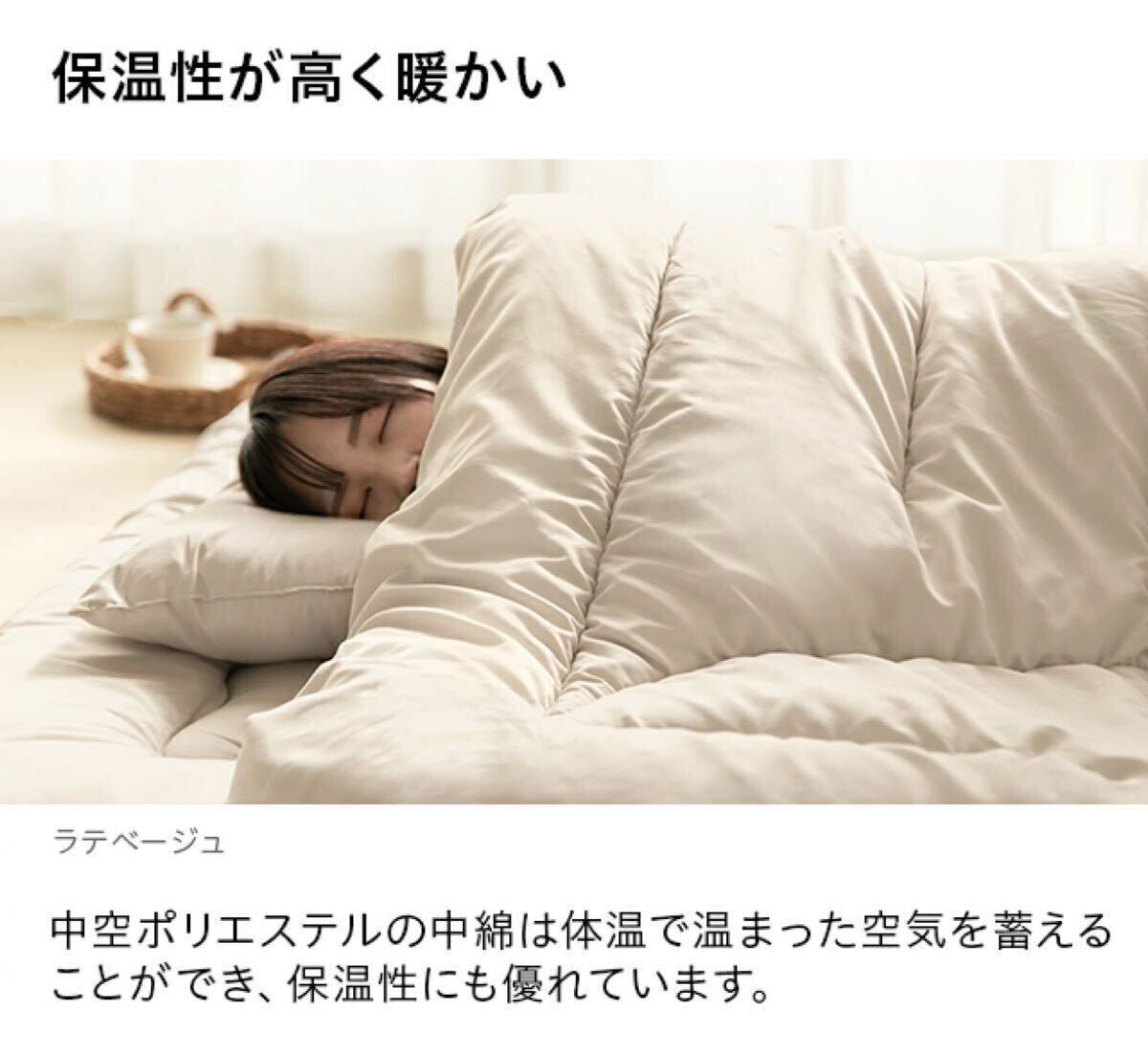 ・掛ふとんの中綿は「中空ポリエステル綿」により、暖かい空気を逃がさず保温性の高い掛ふとんです