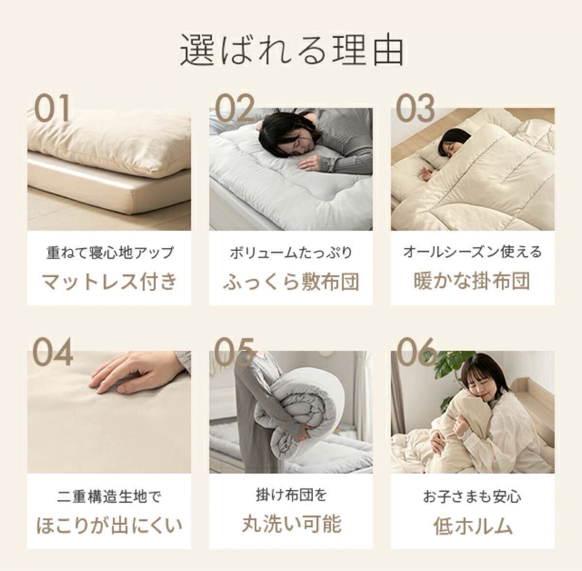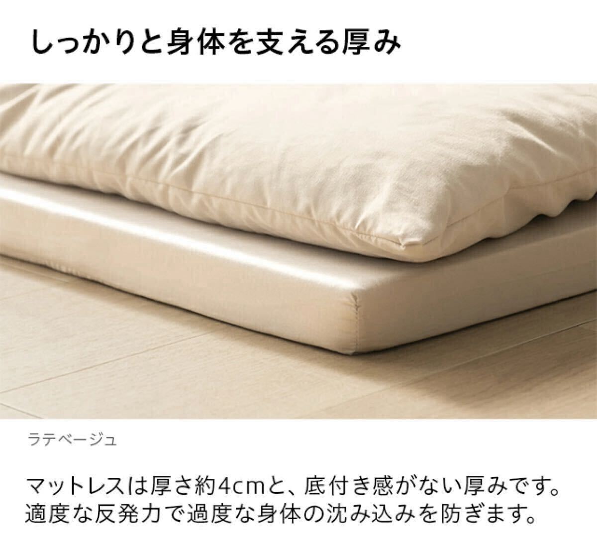 ・厚さ4cmのマットレス+敷ふとんによって、床に直接敷いても底つき感がなくおやすみいただけます