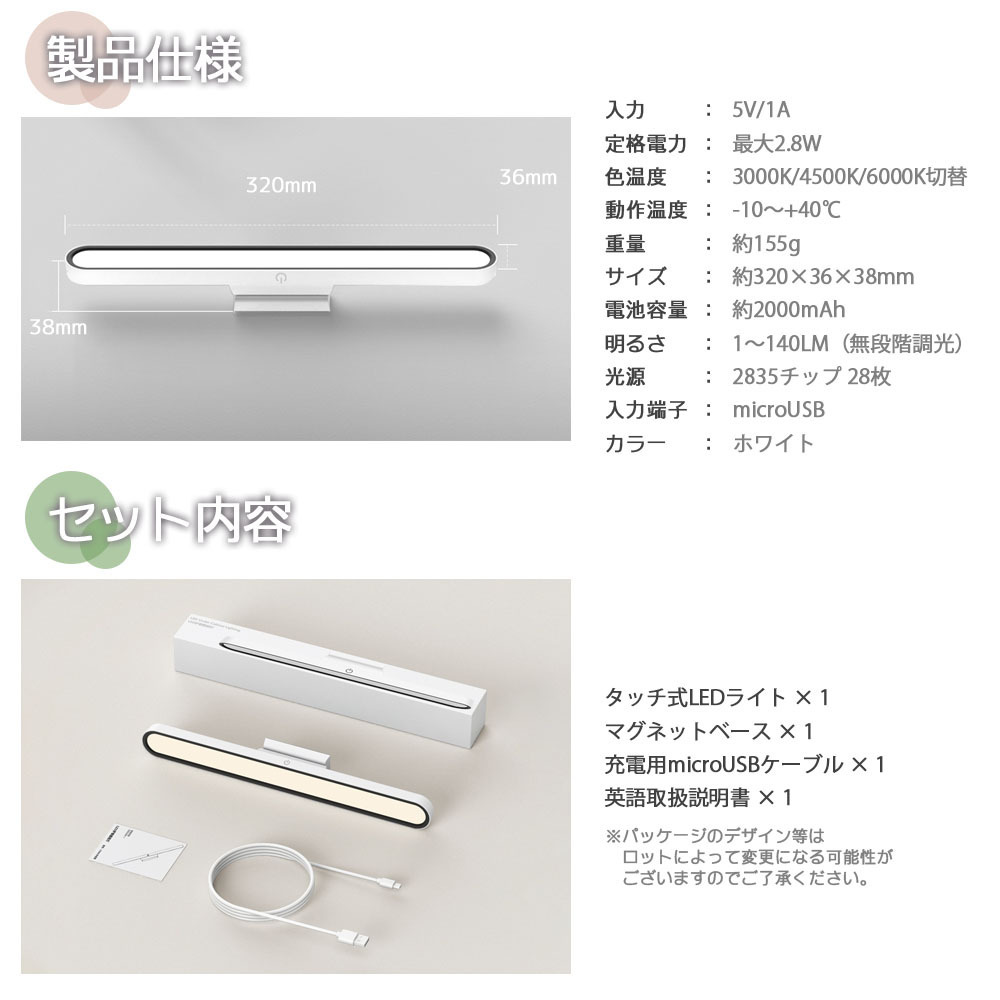 点灯モード:3段階調色(3000K/4500K/6000K)、無段階調光