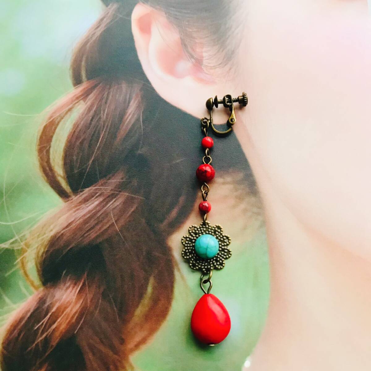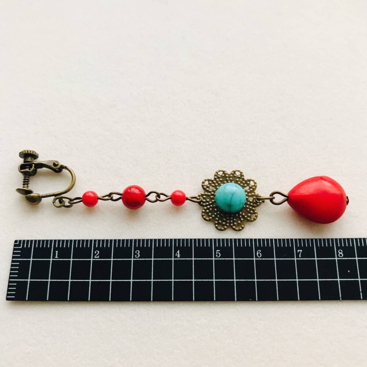 新品即決◆アンティーク調 ハンドメイド イヤリング 練りターコイズ しずく ドロップ レッド ブルー 金古美 手作り アクセサリー 收藏