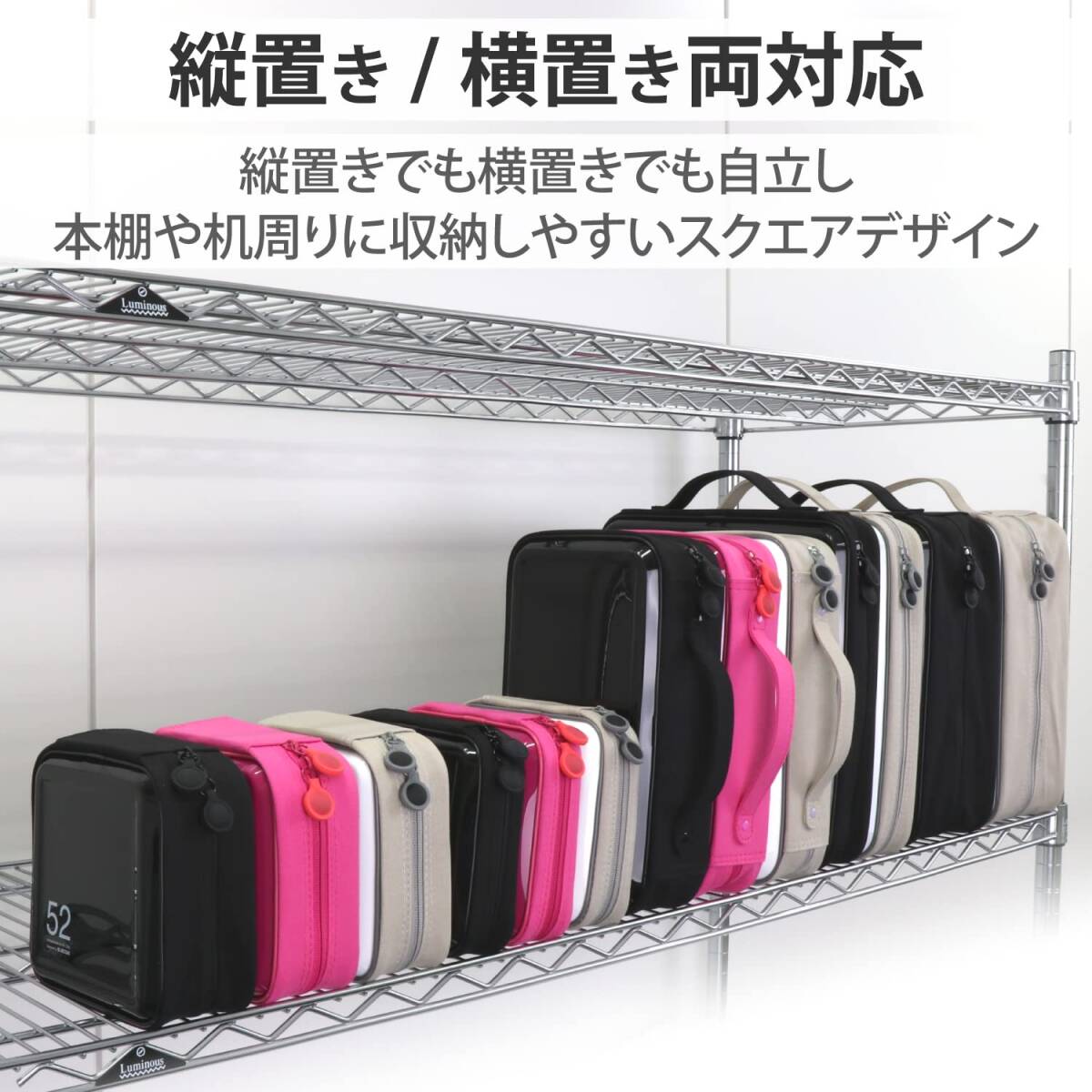■縦置きでも横置きでも自立し、本棚や机周りに収納しやすいスクエアデザインです。
