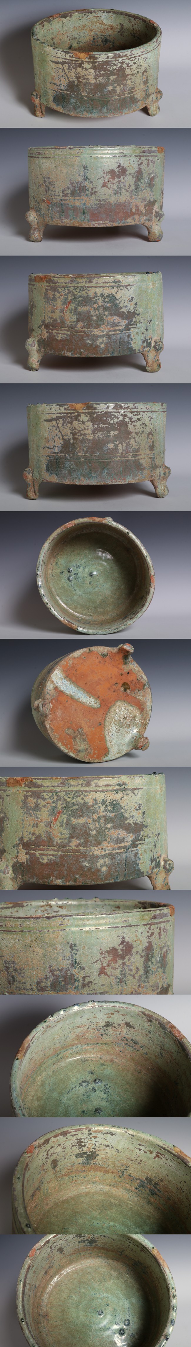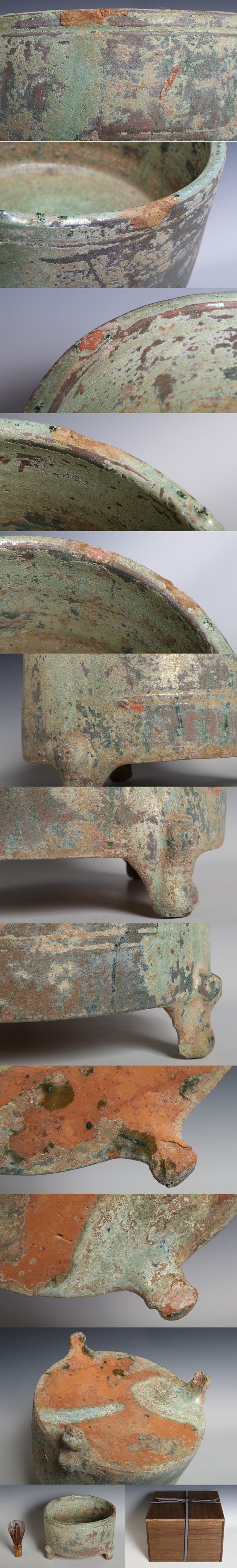 9561 中国陶器 緑釉円筒三つ足香炉(木箱) 約21cm 香爐 香炉 茶道具 香道具 検:青磁 青瓷 漢代 中国 古玩 唐物 発掘 時代陶器 收藏