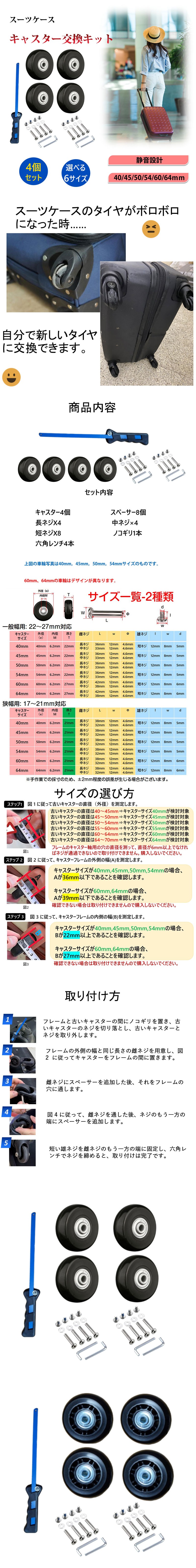 キャスター 交換キット タイヤ 4個セット スーツケース 修理 交換 ノコギリ付 台車 キャリー 部品 車輪 ホイール 直径40 45 50 54 60 64mm 收藏
