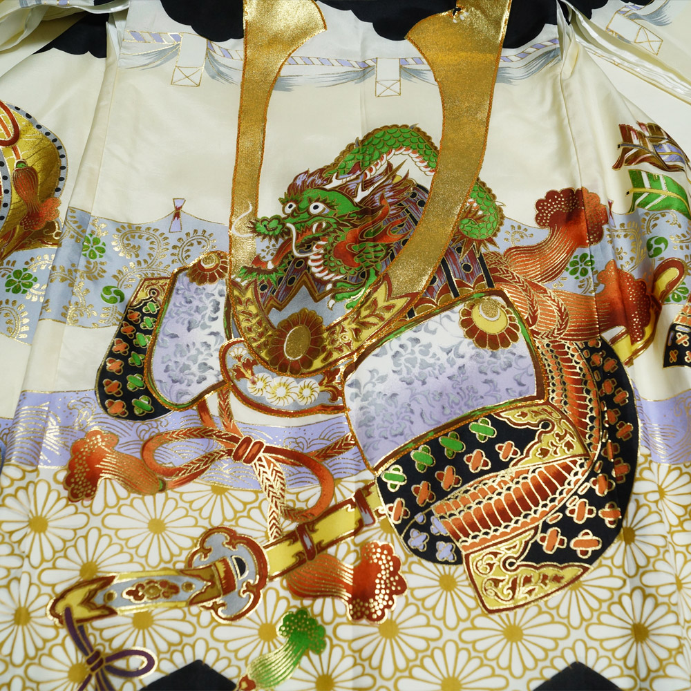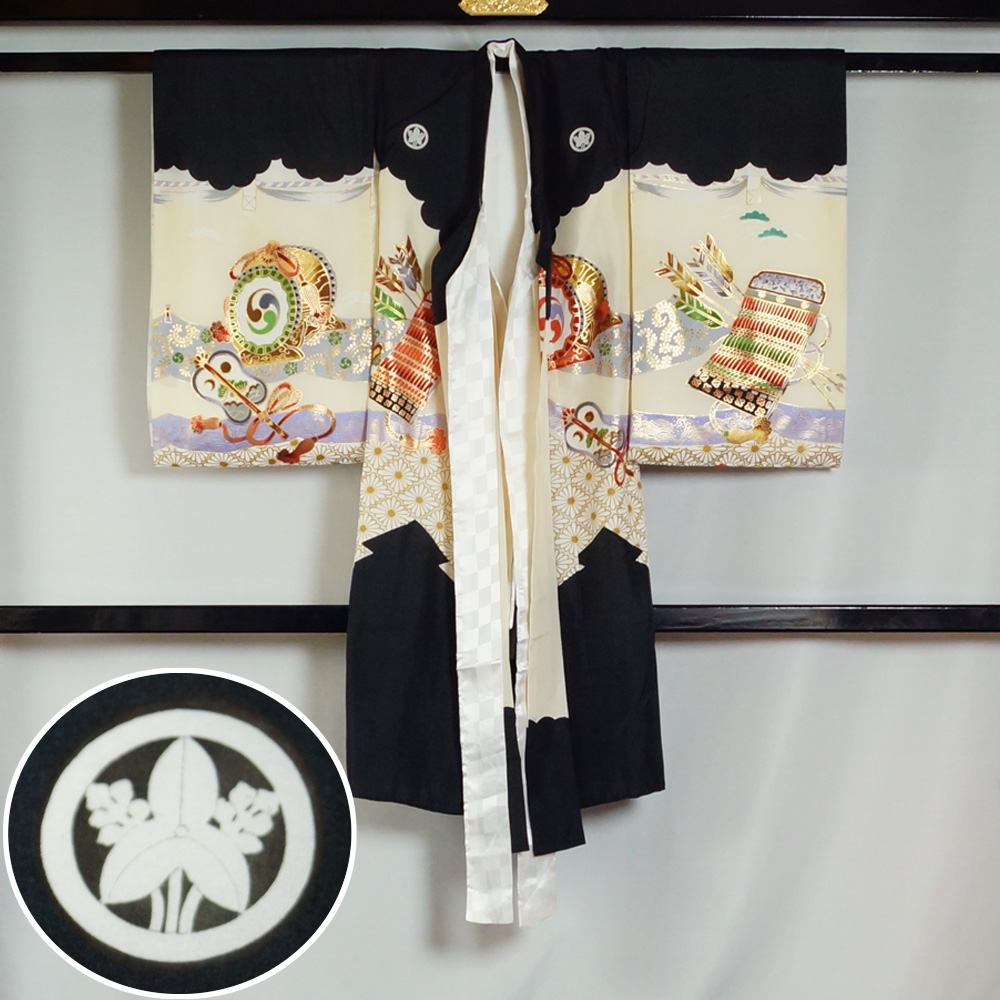 商品 説明 | 黒・乳白色系の羽二重地に兜に幕、龍や菊菱、鼓などの模様が染められた男児用の産着です。長襦袢も付いております。丸に沢瀉紋 五つ紋入りです。 |