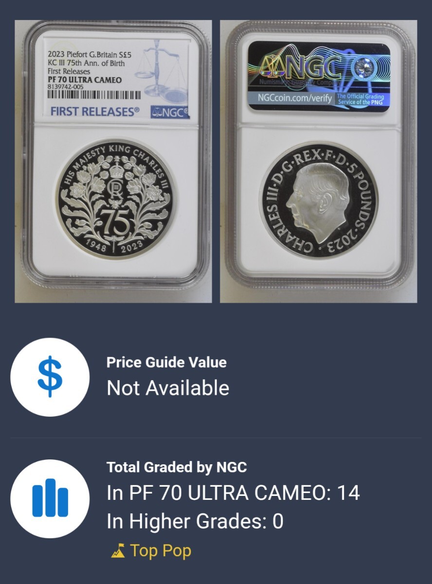 ★最高鑑定NGC PF70UCFRピエフォー倍圧 銀貨 2023年 イギリス チャールズ国王生誕75年 ロイヤルミント 2oz 5ポンド銀貨 鑑定 金貨銀貨出品 收藏