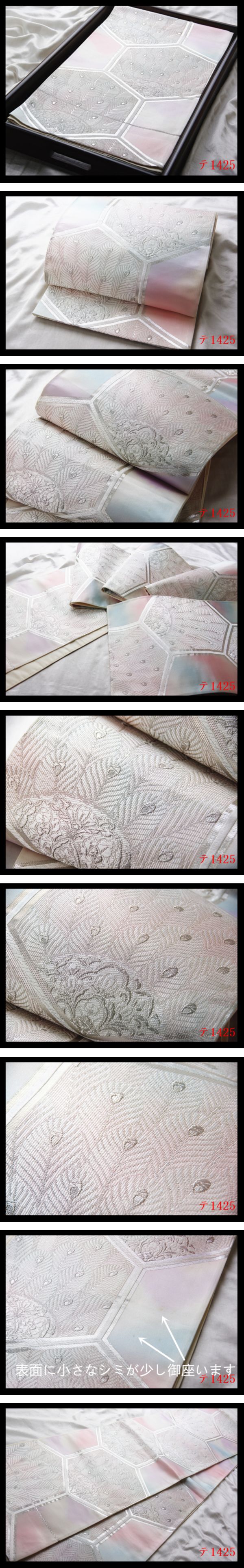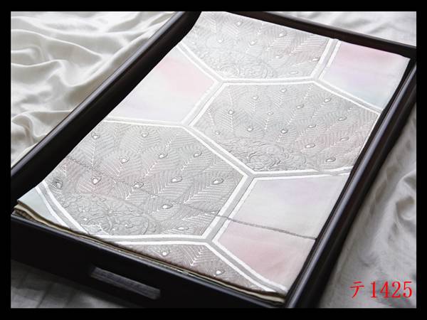 蔵【テ1425】西陣美品 亀甲孔雀紋 シルバー色地 気品豊かに 正絹六通高級美術袋帯 ◇検◇簪着物名古屋帯和装小物帯締め 收藏