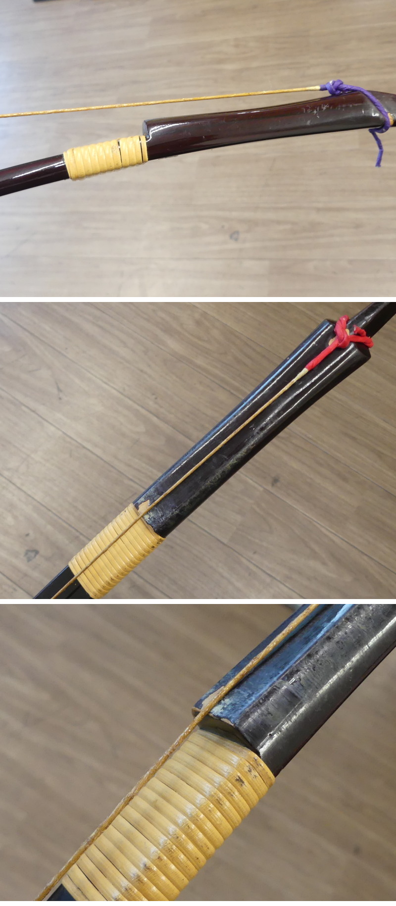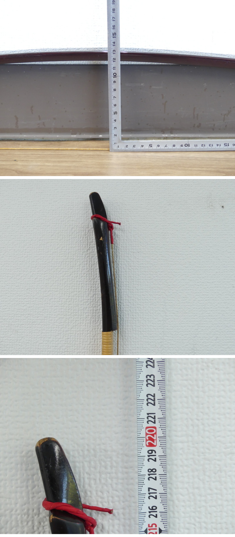 ◇商品情報◇ | 当店の商品をご覧いただきありがとうございます!! グラス弓 弓道 練心 220cm 和弓 重量589g 弓道具 経年相応の傷汚れ、使用伴うダメージなどはございます。 目視の限りでは割れや離れといった箇所は見当たりませんでした。 約/サイズ/cm/弦を張った状態で採寸しています 重量589g 握り下厚み2.3 握り下幅 2,9 ※弦を張った状態で弓の先端から末端まで直線で約220cmでした(画像参照) 弓力につきましては弦の劣化、測定環境が無いた未計測です。 弦については古い弦をおつけしてありますが痛みがある古い弦ですので張替え前提としてお考えください。 弓道経験者、識者がいないため現状でのお譲りとなります。 状態などは画像よりご確認、ご判断くださいませ。 ※目視チェックをしていますが、表記漏れや見落としや細かな擦れ・薄汚れなどがある場合もございますので予め画像をご確認の上でご入札をお願いいたします。 商品のトップ画像端に写っている茶筅はサイズ比較用の備品ですので付属はしません | ||||||||||||||||||||||||||||||