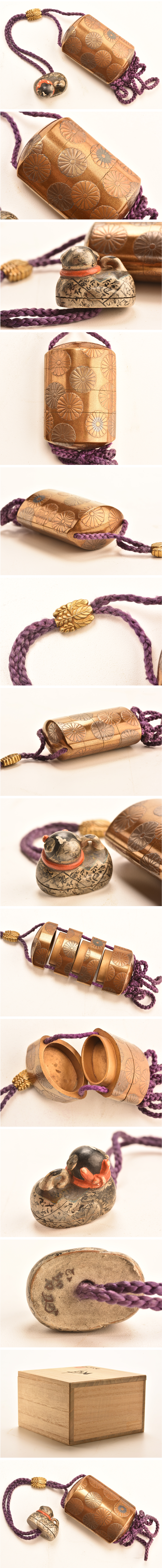 印籠 幅 約5.5×4.0cm 高 約2.2cm 根付 幅 約2.7×2.0cm 高 約2.0cm 緒締 幅 約1.3×0.9cm 高 約0.5cm |
