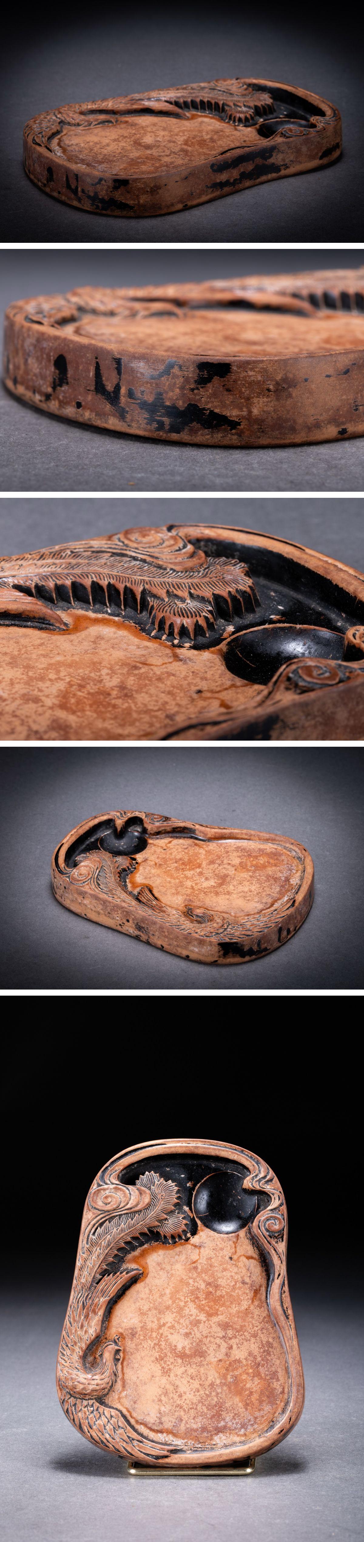 【華】時代舊藏 清時代 紫砂朱泥「翰墨斎」在銘 鳳鳥文文房硯 時代物 古美術 骨董品A25070303-QR 收藏