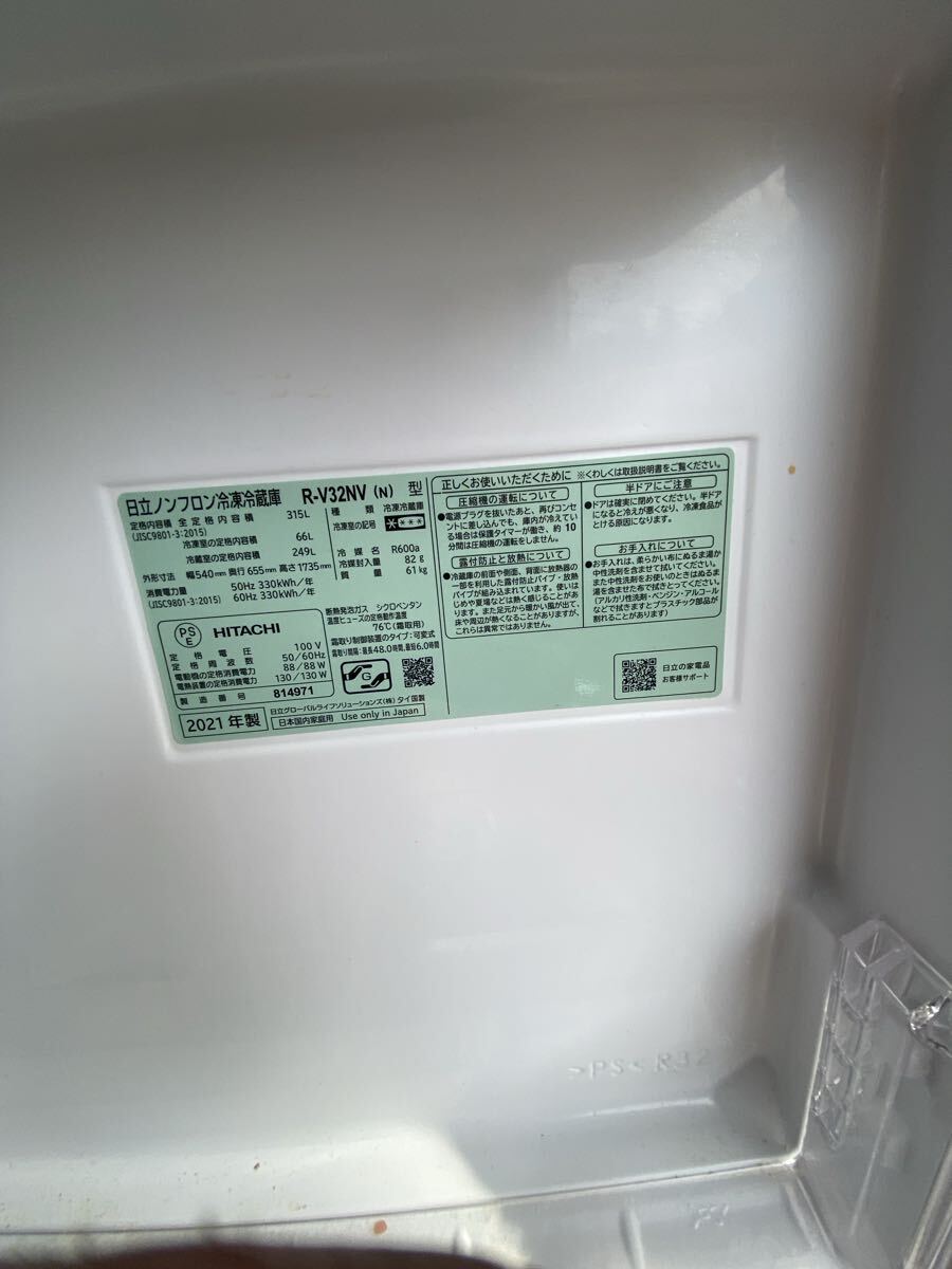日立ノンフロン冷凍冷蔵庫 2021年製R-V32NV(N)315L 冷蔵室249L 冷凍室66L 外径寸法幅540mm奥行き655mm 高さ1735mm質量61kg 收藏