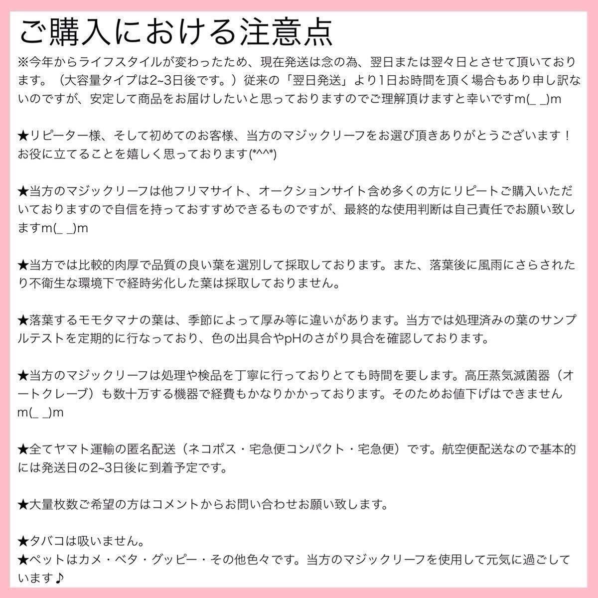 ・一般的にマジックリーフは水20Lに対して20cm~の大きめの葉1枚が使用目安です。