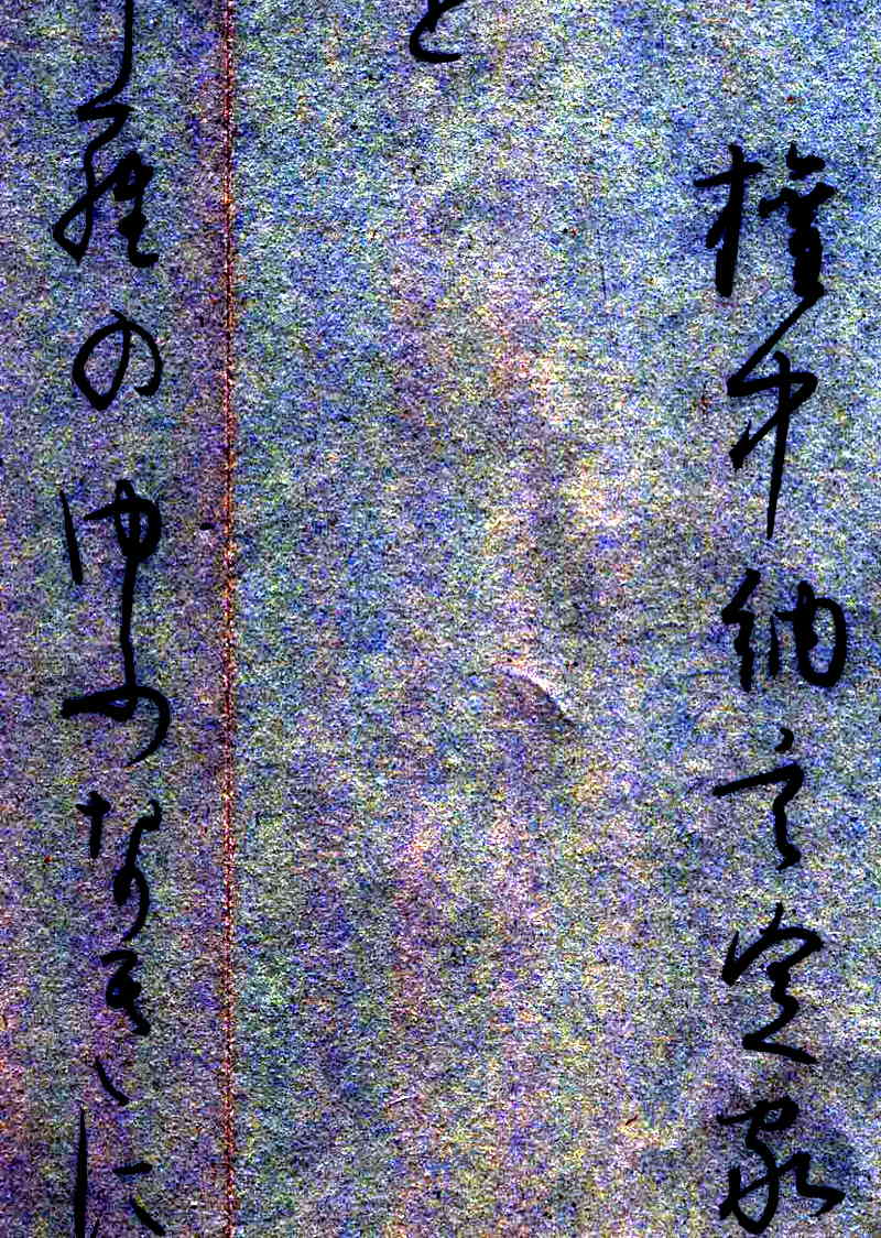 入手したものであることがわかりました。日本の和紙は(す)く製法であるため和紙の繊維が断層画像写真によって一本一本が立体的に見えます。オランダ渡来の髪と性質が異なるのはこのためです。は茶会用の掛軸から外され海外展示のために再表装をしております。掛軸や屏風にすることが可能なように、「Removable Paste(再剥離用糊)」を使用しているため、自筆の書に影響をあたえずに、容易に「剥離」することができるような特殊な表装となっております。