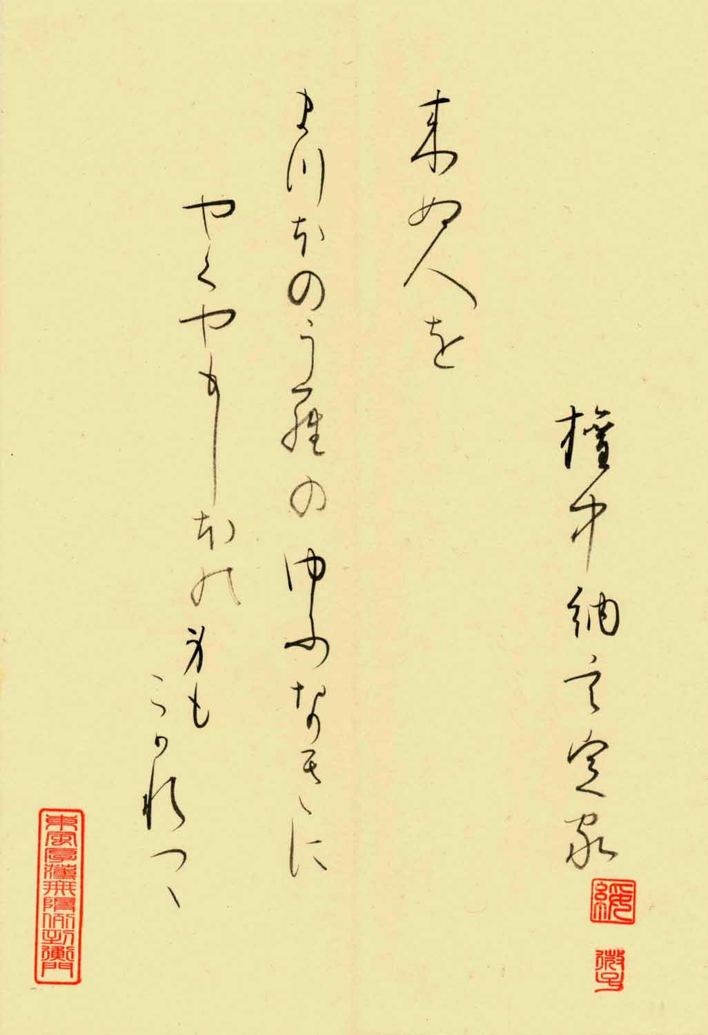 伊達徽子(のりこ)・自筆「百人一首」の和歌の書を出品いたしました。出品以外の所蔵品を紹介した出品者のホームページ「源氏物語の世界」をご覧ください。