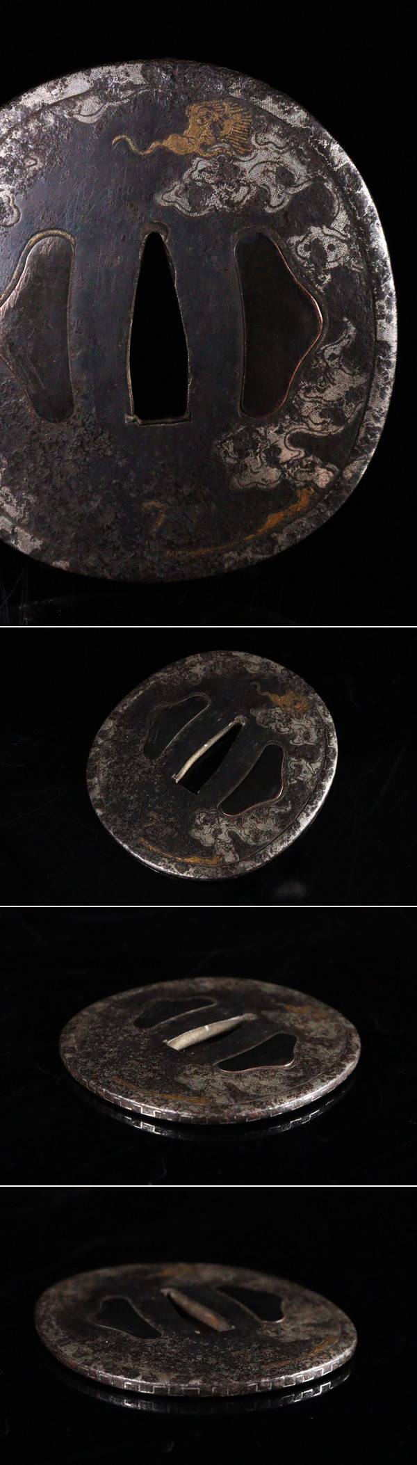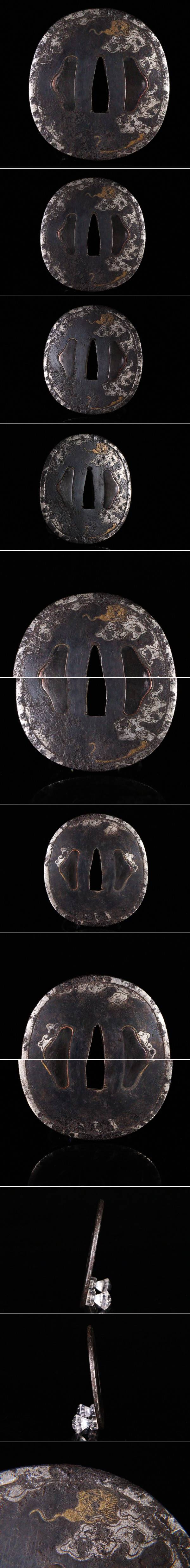 【ASAHI】時代 肥後 鉄地 金銀象嵌 龍文鍔 7.5cm 細密細工 刀装具 時代武具 コレクター収蔵品[78211qu] 收藏
