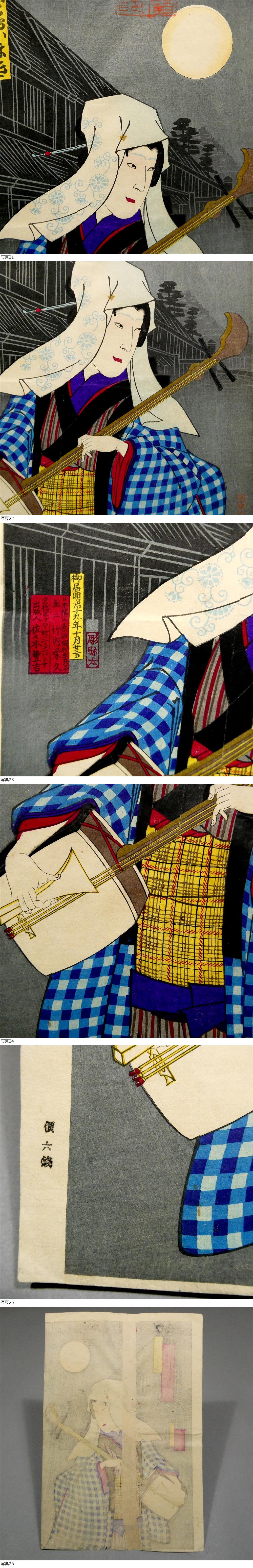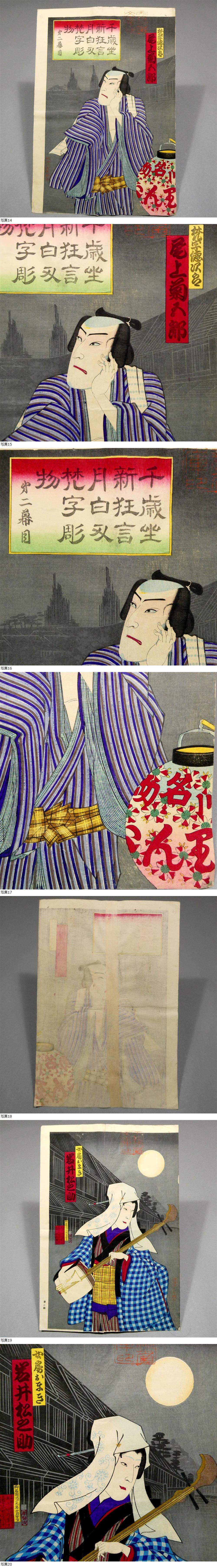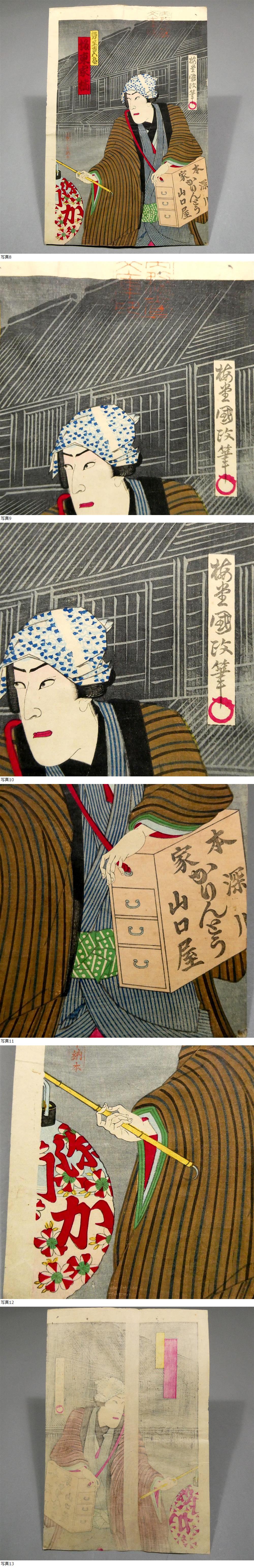 歌川国政◆明治19年 木版浮世絵◆「月白刃梵字彫物」3枚続揃い◆“深川 かりんとう 山口屋”◆梅堂国政 国貞三代■引札 広告 錦絵 役者絵34 收藏