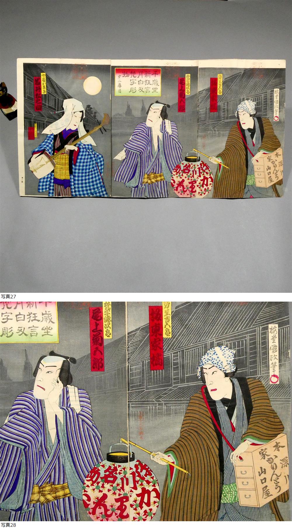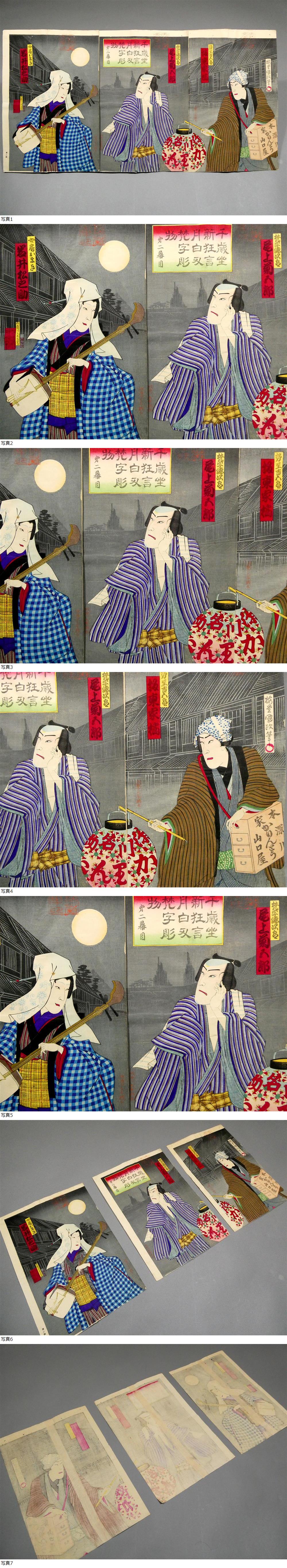 ■ 歌川国政 明治19年 木版浮世絵 「月白刃梵字彫物」 3枚続揃い “深川 かりんとう 山口屋” 役者絵 ■