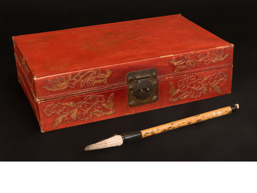 ●合春號 本舗住【鹿港】自造各色 厚皮金朱頂上箱 皮張古箱【斑竹筆 敬神】中国 台湾● 收藏