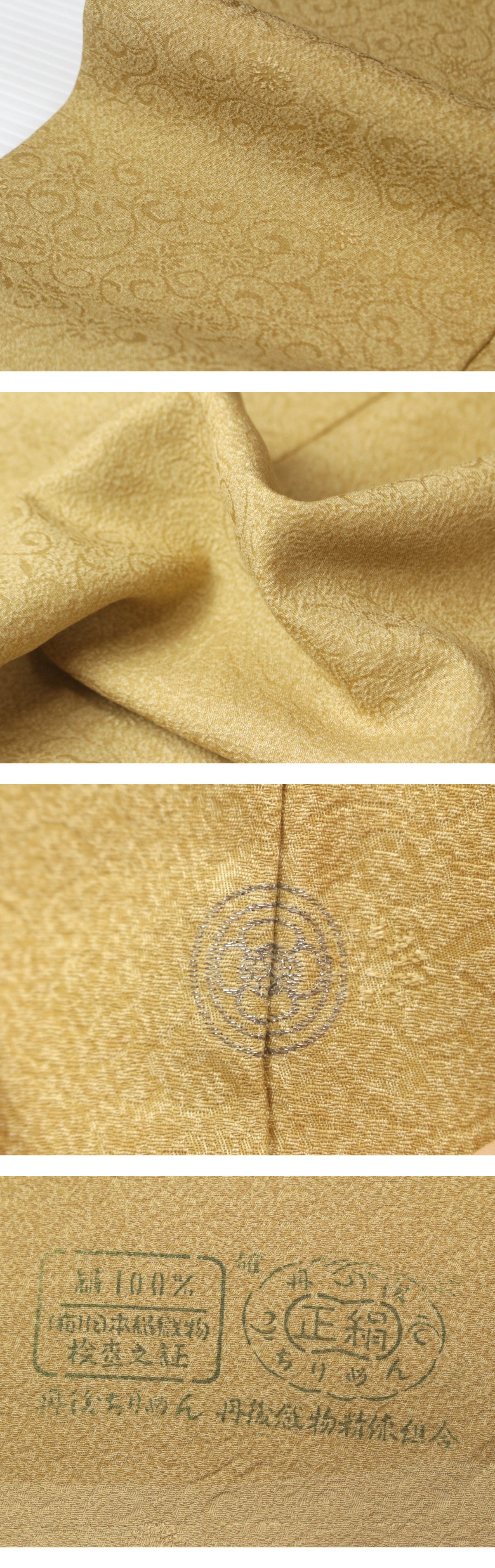 丹後ちりめんの上質な正絹地を用いた色無地のご紹介です。 地色は落ち着いた黄土系で、上品かつ温かみのある印象、全体にさりげなく地紋が施され、無地ながらも奥行きを感じさせます。 背中には一つ紋が入り、略礼装として幅広くお使いいただけ、帯合わせ次第で、式典からお茶席まで対応可能です。 お目に留まりましたら、是非ご検討くださいませ。 ※撮影時の部屋の照明によって画像の色に若干の差がございます。色味に差がございますことをご了承のうえご検討下さいませ。 …状態… 背中心付近に一点シミあり。その他状態良好。 ※全くの新品ではございませんので、記載のない変色やスレ、ヤケ、その他僅かな難がある場合がございます。そのような理由でのキャンセルはお受けできませんので、ご了承の上ご検討お願いいたします。 |