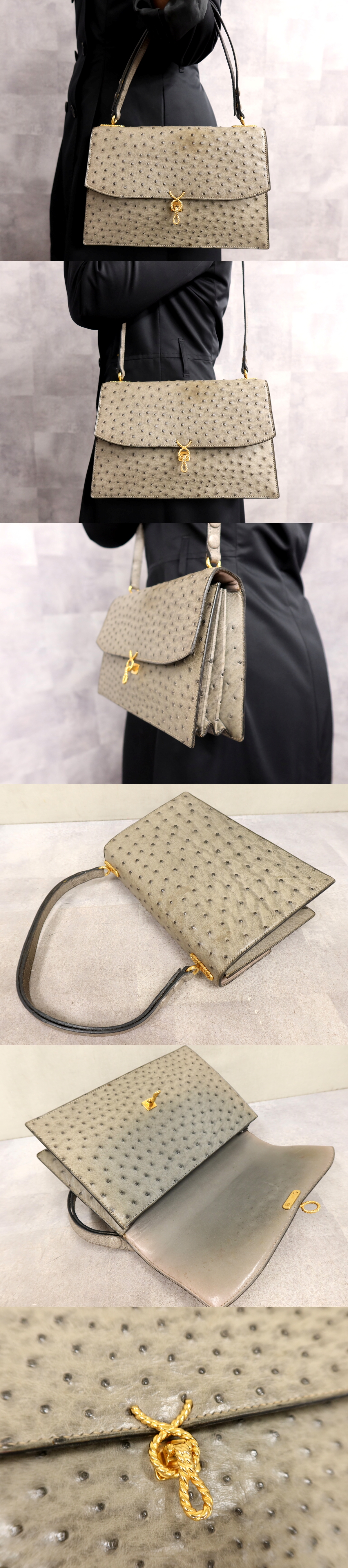 ●美品●MORABITO モラビト●プリンセス●フラップ●オーストリッチ 本 ダチョウ 革●ショルダー ハンド バッグ●グレー●G金具●Js64894 收藏