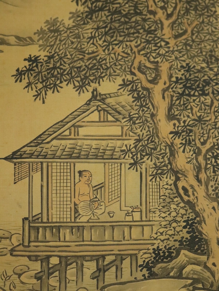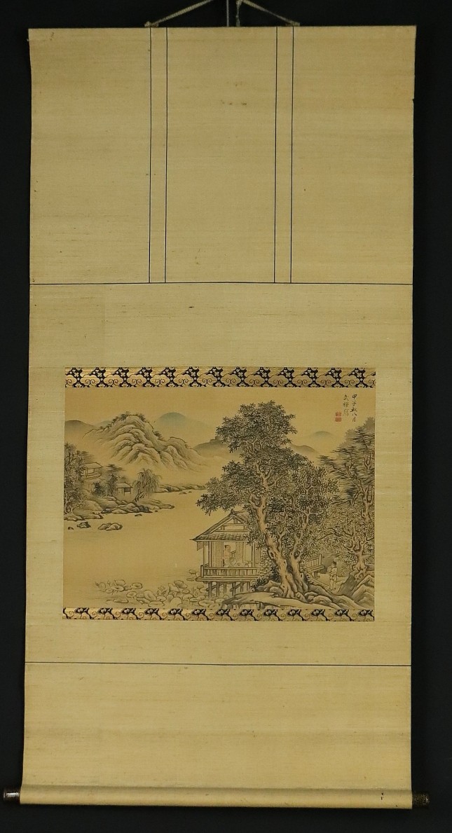 12706■【真作】墨江武禅 山水図 絹本 肉筆 江戸時代 浮世絵師 大阪の人 月岡雪鼎に師事 掛軸 收藏