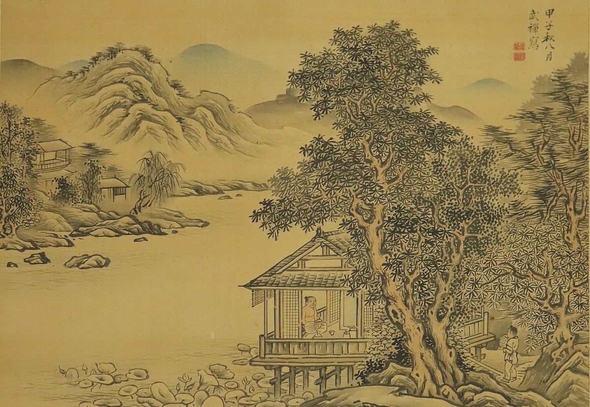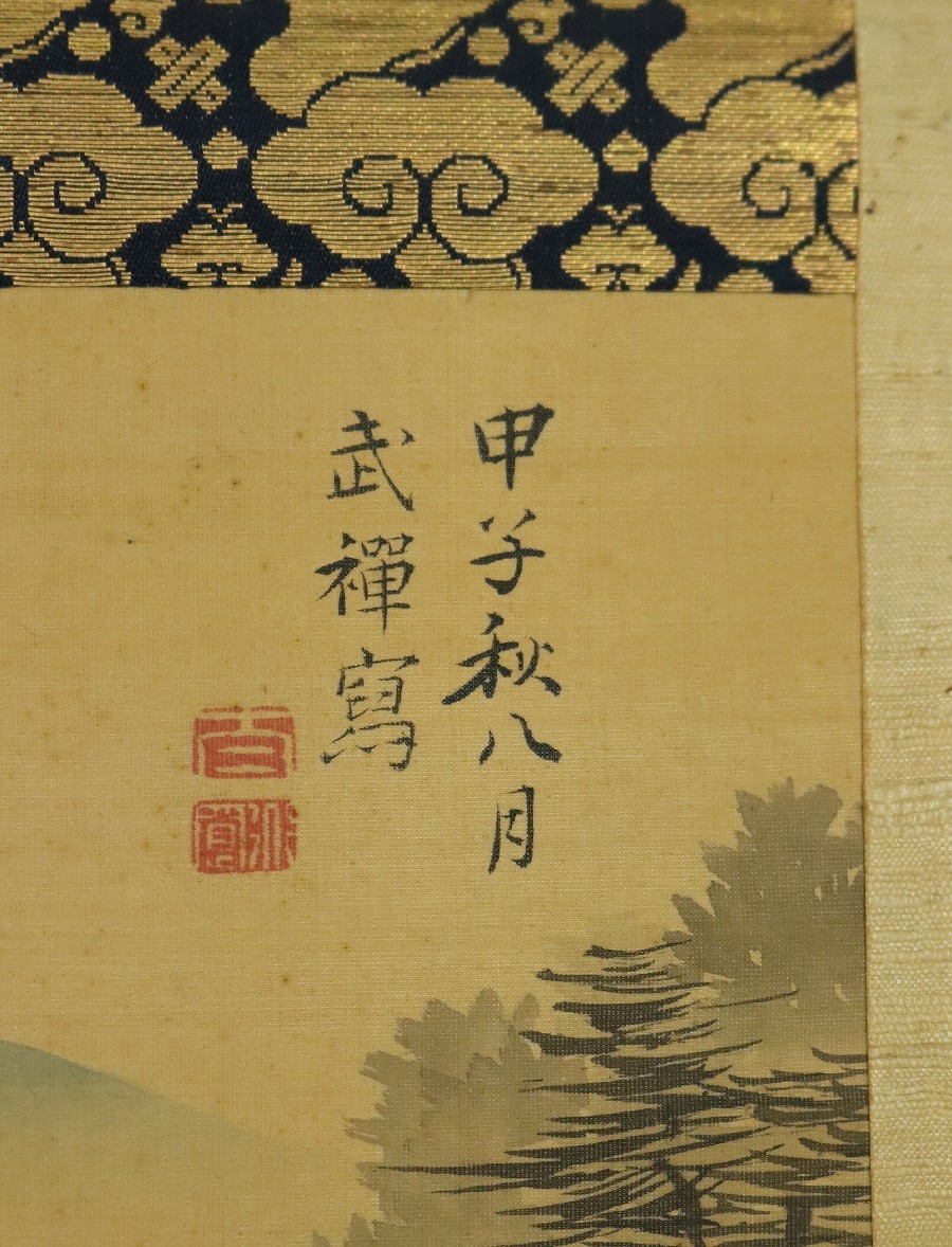 12706■【真作】墨江武禅 山水図 絹本 肉筆 江戸時代 浮世絵師 大阪の人 月岡雪鼎に師事 掛軸