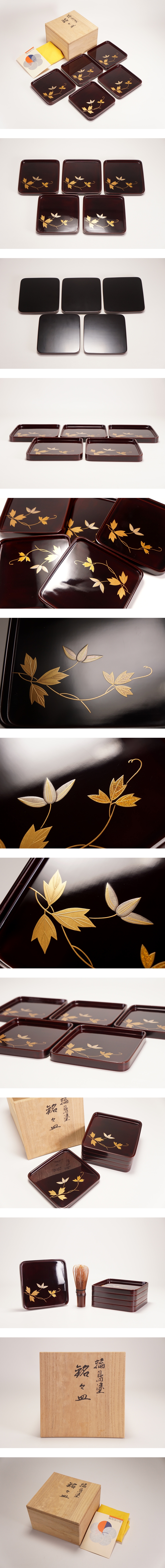 【asiya385】輪島塗 蒔絵 花紋 銘々皿 五客 瓶座 急須台 共箱◆美品 煎茶道具 茶器 蔵出し 古美術 即決 送料無料 收藏