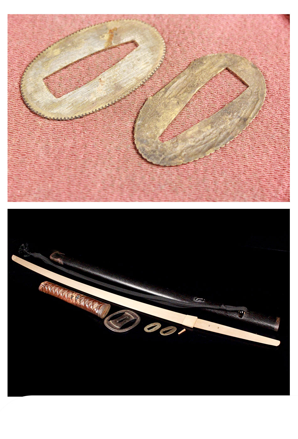 【喜楽】変わり肥後鍔!! 肥後革柄巻き柄 赤銅時代馬目貫!! 時代肥後刀用拵え 刀装具!! 111975-112466 收藏