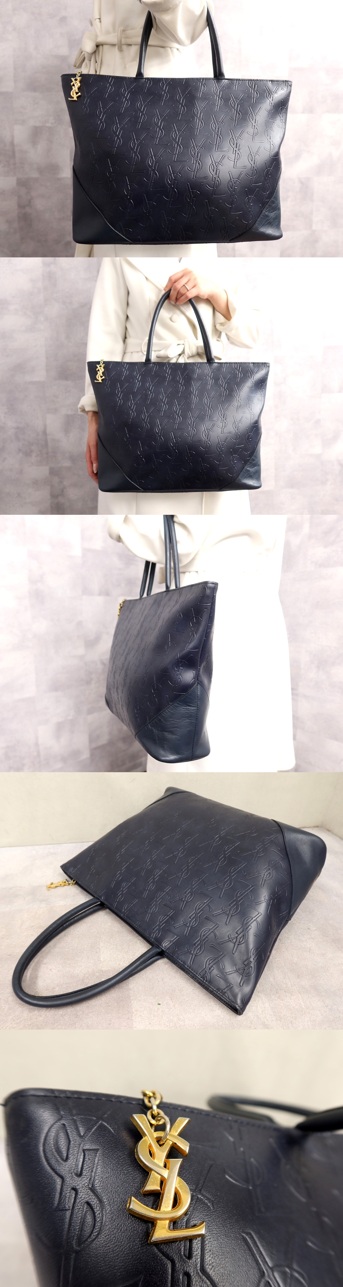 ●美品●YSL Yves Saint-Laurent イヴ・サンローラン●ロゴエンボス●PVC カーフ レザー 本革●トート バッグ●ネイビー●A4 収納●Js66104 收藏