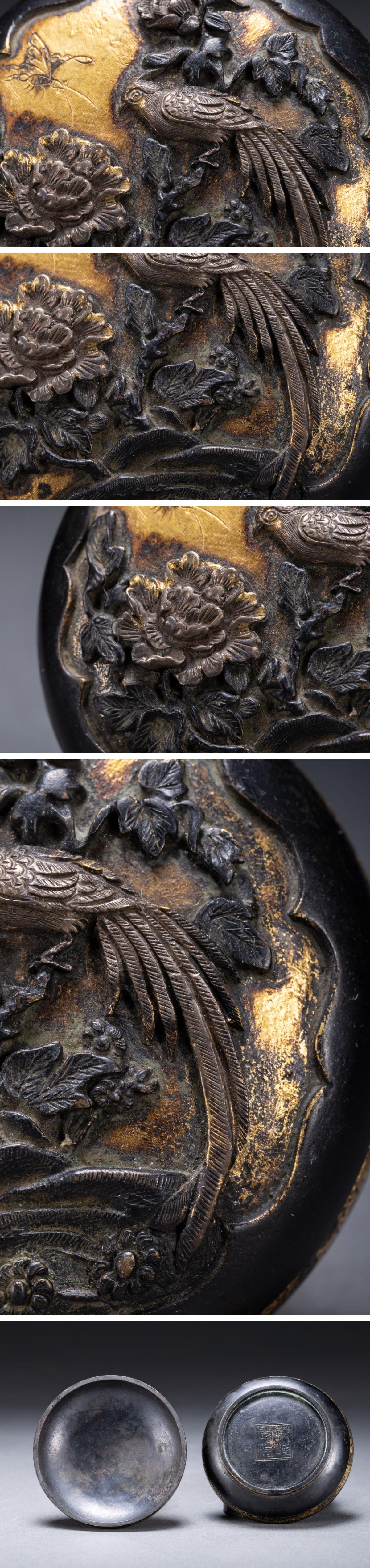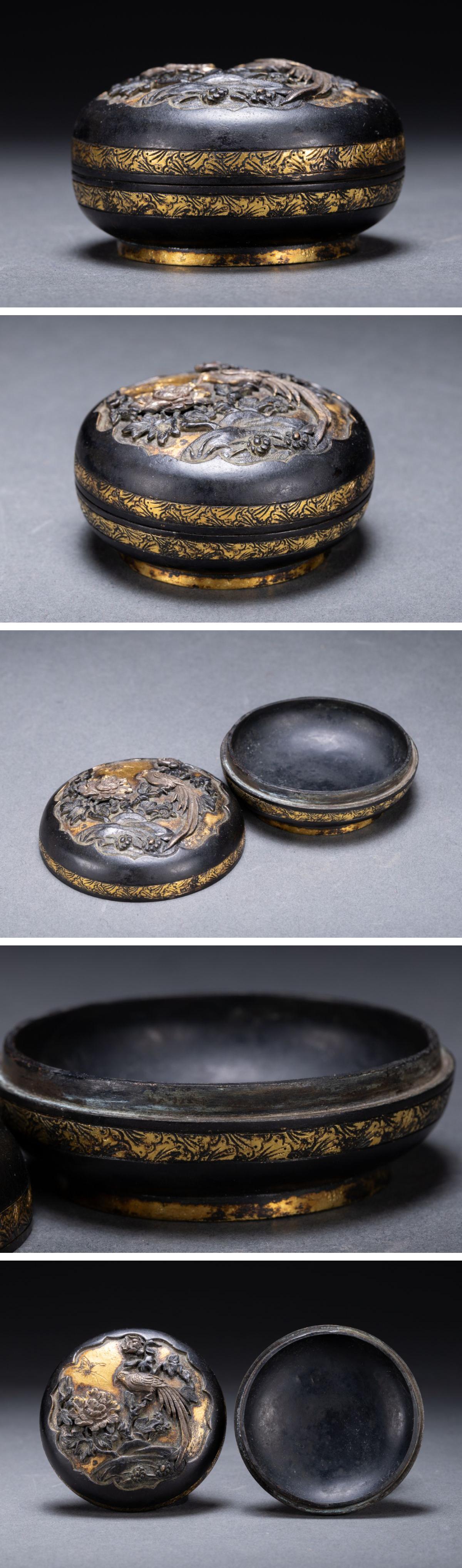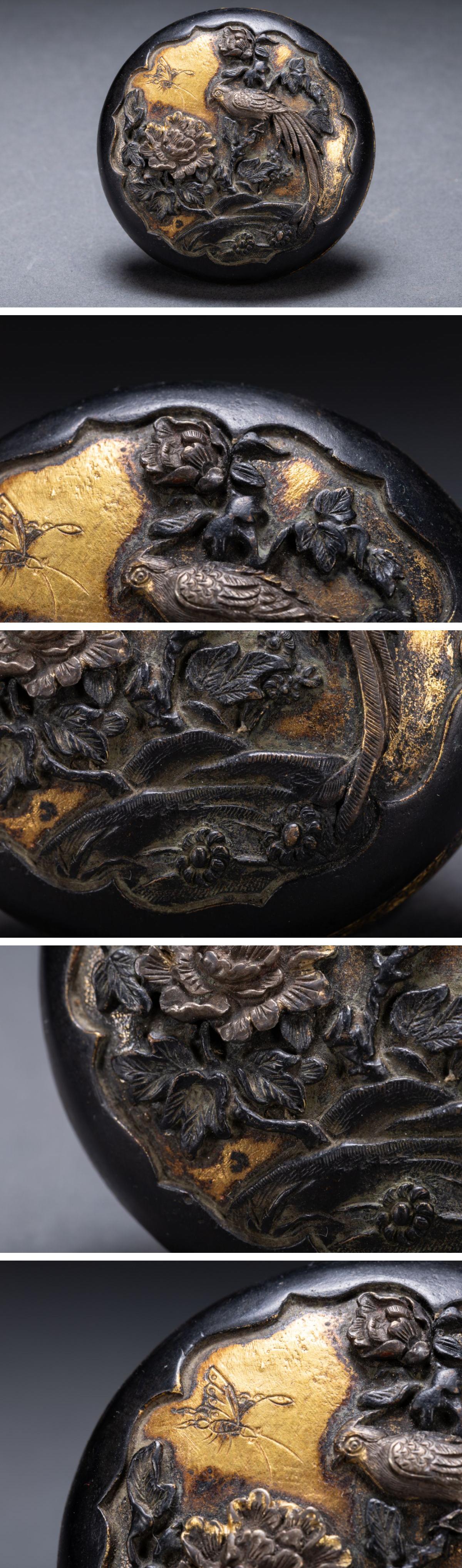 【清】関西某オークション購入 江戸時代物 銅金 象嵌金銀花鳥紋香合 当時物 時代コレクション8L1-26S 收藏