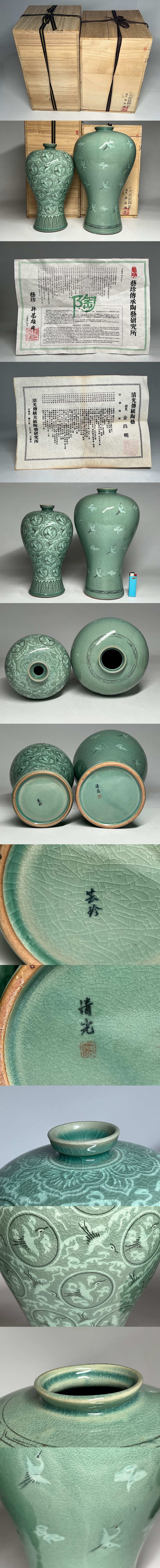 高麗青磁 花瓶 2点 まとめて 共箱 栞 (藝珍 神基雄、清光(金昌明)) ◆商品詳細 寸法(約):26.5x13x4.3(高×幅x口径cm) 312.6x16x6(高×幅×口径cm) ※寸法に若干の誤差が生じる場合もございます。 共箱にシミ、カケ、アタリ傷が有ります。 汚れがありますので、 ご承知の上入札お願いします。 状態等画像にてご確認の上ご入札よろしくお願いいたします。 ◆発送先等のご連絡とお支払いについて ※発送先等のご連絡 落札時から48時間以内にお願い致します。 ※お支払 かんたん決済の期限内にお願い致します。 ※複数点落札時にまとめて取引の場合(72時間内)に、 まとめて取引の取引手順(落札者方の操作)を参考にお願い致します。 梱包したサイズを測って、地方によって送料を決めますので、よろしくお願いします。 ◆掲載画像について ※画像は現物を撮影しておりますが、照度、遮光、モニターによっては実物と 色目が異なって見えることがありますのでご注意ください。掲載画像では確認 できない傷や汚れがある可能性もございます、あくまで 中古品であるということをご承知の上、御入札をお願い致します。 ◆補償について 商品到着後はすぐに状態の確認をお願い致します。 商品の破損等がございまし たら、箱や梱包材など全てそのままの状態で保存し、お早めにご連絡ください。 (到着日から一週間以上経過、梱包材の廃棄済み等の場合、保証は致しかねます のでご注意ください。) ◆返品について 思っていたイメージと違う、などのお客様主観による返品はお受けできません ので、予めご了承ください。ノークレーム、ノーリターンでお願いします。届 いた商品が商品説明と著しく異なる場合(寸法、キズ記載ミスなど)のみ承り ます。早めにご連絡ください。 ◆注意事項 当方の希望価格と隔たりがある場合は、終了前にやむなく取下げさせて頂く場 合がございます。 ※商品ご落札翌日から4日間以内にご連絡が取れない場合は、入札取消の処置を 取らさせていただく場合がございます。 ※評価の悪い方は取り消す場合がございます。 ※原則として当方の不備以外のキャンセル・返品・返金は受け付けておりません。 以上の点を予めご了承頂いた上で、入札・落札お願い致します。 ◆発送方法 ▼ゆうパック(補償あり/追跡あり) 梱包後のサイズ:~約120cm ※送料全国一律1830円 (但し北海道、沖縄、離島は+500円いただきます。) 発送元は静岡県となります。 ( 商品の組み合わせによっては同梱をお断りさせていただく場合があります。) ※大型商品について 郵便局の規定を超える商品の場合は、佐川急便またはヤマトでの発送となります。 |