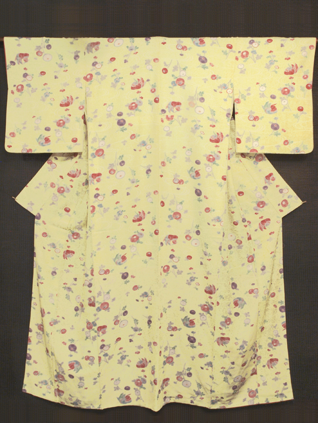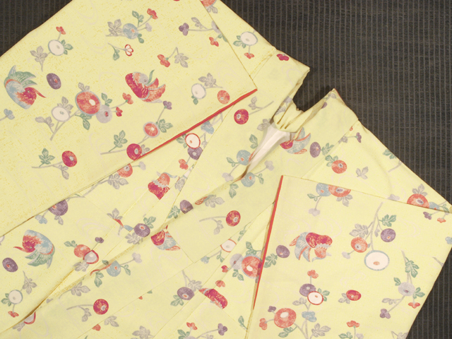 やや淡い中黄色の地に、あられの地紋が織り出され、流水の地紋が染め抜かれるとともに、鴛鴦(おしどり)と万寿菊の文様が型染めされている、紋縮緬の小紋です。袷仕立てです。 素朴なタッチであらわされた文様にコミカルなかわいらしさが感じられます。シャリ感のやや強い、たてシボのある楊柳(ようりゅう)縮緬の小紋です。 ユーズド品と思われますが、使用感はほとんど感じられません。目につくしみやよごれなどのダメージもなく、たいへんきれいな状態です。 |