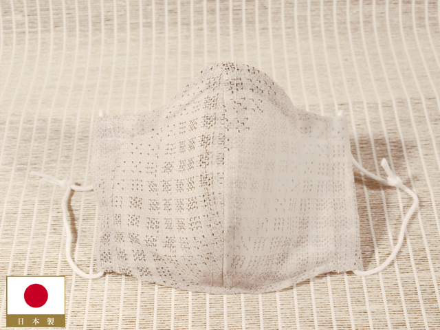 わずかに茶色味のあるきなり色の地に、黒鳶(くろとび)色とごく淡い銀煤竹色の絣で角通しの文様が織り込まれている、夏紬地の和装マスクカバーです。日本国内製ハンドメイドのお品です。ノーズワイヤーが入っており、交換も可能です。裏地には白色無地の阿波しじら織の綿地が配されています。 何気ない意匠がはかなげな雰囲気で、主張しないので、合わせやすいです。十日町で織られた夏着物用の未使用の織地から製作されたもので、透け感があり、涼やかです。裏地の阿波しじら織はシボの凹凸があり、強い吸湿性と高い速乾性があるので、肌にまとわりつかず、快適です。裏地との間にはポケットがあり、フィルターを入れていただければ本格的なマスクになります。また、マスクなので夏季以外にお使いいただいても問題はありません。耳掛けのゴムはご自身で調節の上、結び目をマスク端部のループ内に入れることができます。手洗い可能です 新品です。未使用の織地を素材としているので、気持ち良くお使いいただけます。ハンドメイドですので、若干の縫製のムラ、ゆれなどはあるかもしれませんが、ご理解、ご了承くださいませ。 |