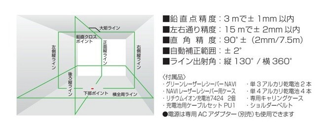 標準付属品でグリーンレーザーレシーバーNAVI、NAVIレーザーレシーバー用ケ-ス、リチウムイオン充電池7424x2個、