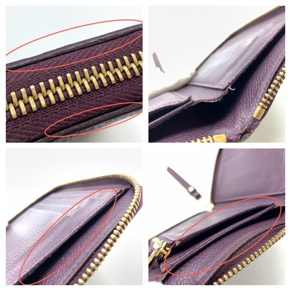 コバにひび割れ、金具に色落ちとキズ、角スレと白い汚れ、小銭入れに生地剥がれがみられます。