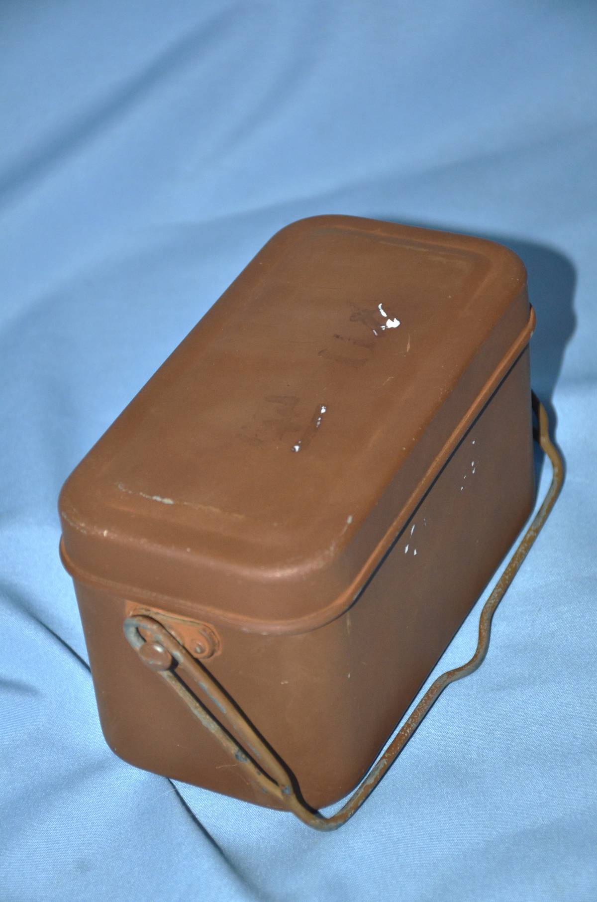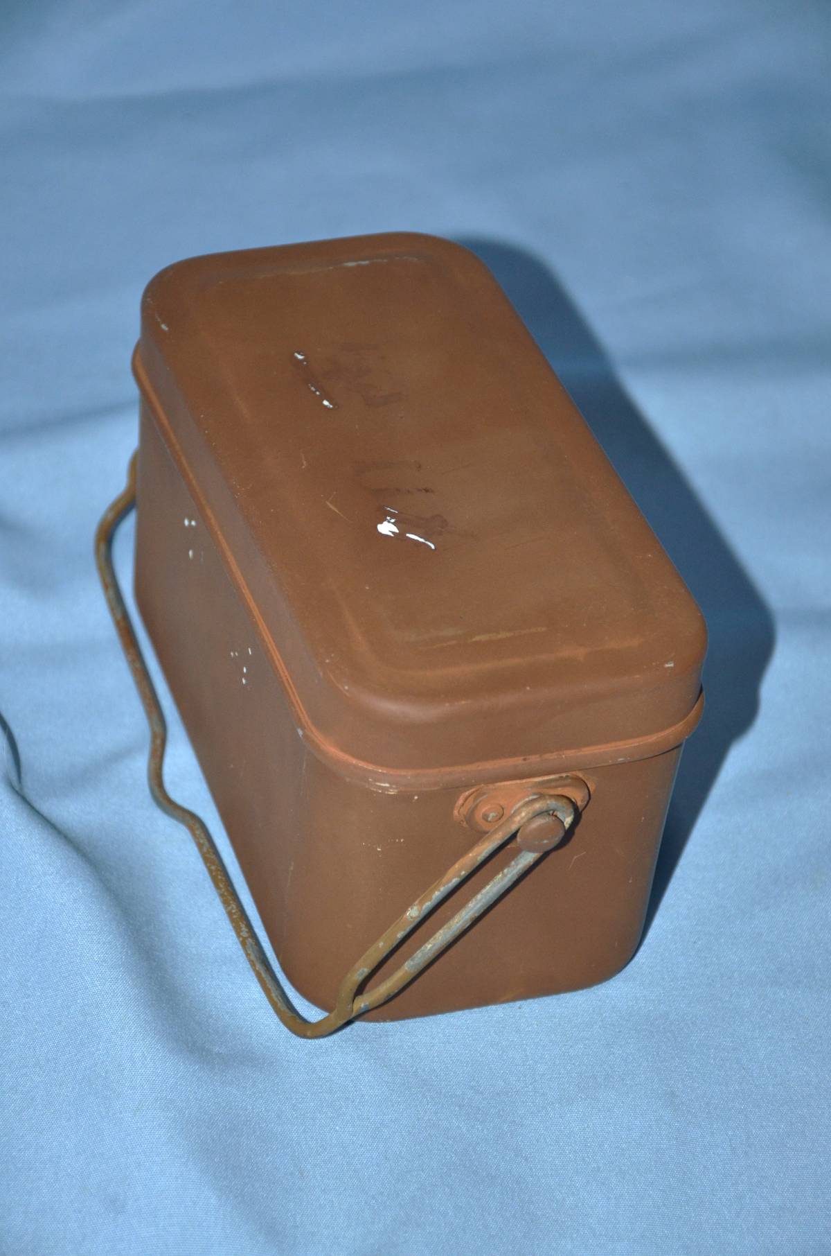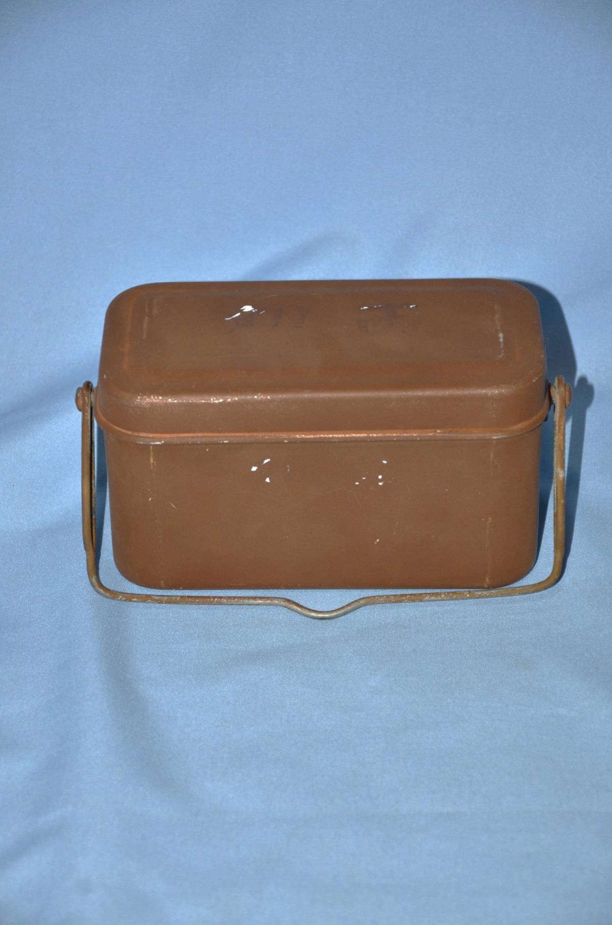 陸軍将校用の旧型飯盒です。飯盒としての機能を考えた取っ手が付いています。実際に舞台で使われたときは弁当箱として使われ、飯盒として御飯を作る事はありませんでした。オリジナルの塗装が良く残っていて、蓋に「西川」の文字がうっすら残っています。これが良く判りません。白ペイントならはっきり残ると思います。再塗装で文字の上から吹き付けたとしたら、逆に文字が見えなくなると思われます。疑問点として提示しておきます。サイズは、9センチ×17.5センチ×9.5センチです。本文下の追加写真もご覧ください。ヤマト運輸宅急便で、全国一律700円でお送り致します。円滑にお届けするために、出荷はヤマト運輸に限らせていただいています。「新規」又は1桁の評価の方は、終了24時間以上前に御落札の意志を質問蘭からお入れください。意思表示が無かった場合は、他の御入札の方々に御迷惑をかける場合が多いので、落札後でも削除刺させていただきます。御入札中の方で、「新規」又は1桁評価の方の入札妨害を受けていると感じた方は、御質問蘭で御連絡下さい。回答しますとその方のIDが表記されますので、無回答で対処いたします。
