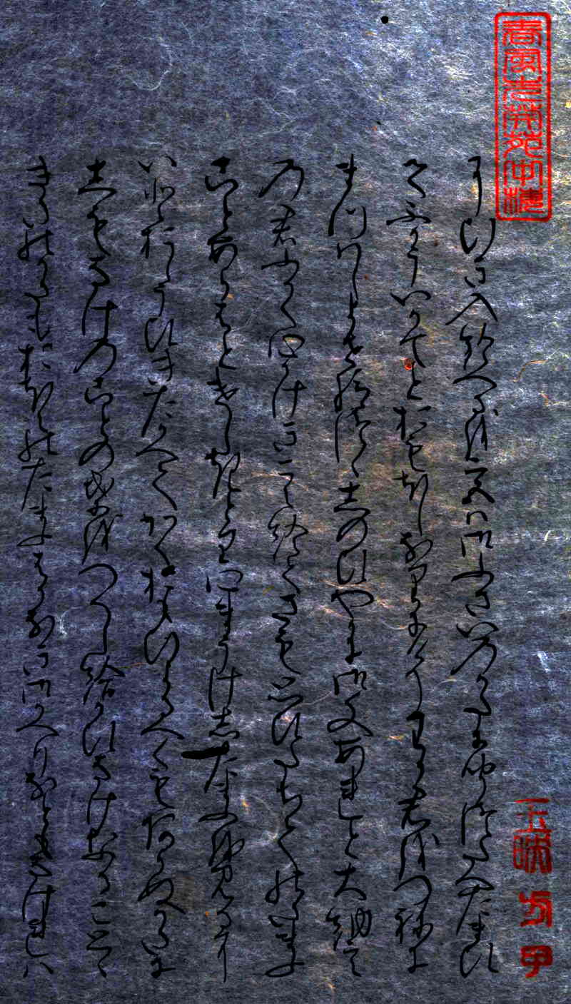 自筆の稀少価値は、和紙の生成技法の緻密さにあります。上の「拡大断層(MRI)写真」でわかる通り、極めて薄い和紙の上に墨の文字がくっきりと浮き上がるように「源氏物語」の文字が記されております。 出品している書の「断層(MRI)写真」の原板は、レントゲン写真と同じ新聞の半分ほどの大きさのフィルムです。肉眼では見ることのできない和紙の繊維の一本一本のミクロの世界を見ることができます。日本国内では医療用以外には見ることのできない書の「断層(MRI)写真」です。 古切の書は、一旦表装を剥離し分析と鑑定検査のために「断層(MRI)写真撮影」をしております。撮影後、展示のために再表装をしております。掛軸や屏風にすることが可能なように、「Removable Paste(再剥離用糊)」を使用しているため、自筆の書に影響をあたえずに、容易に「剥離」することができるような特殊な表装となっております。 |