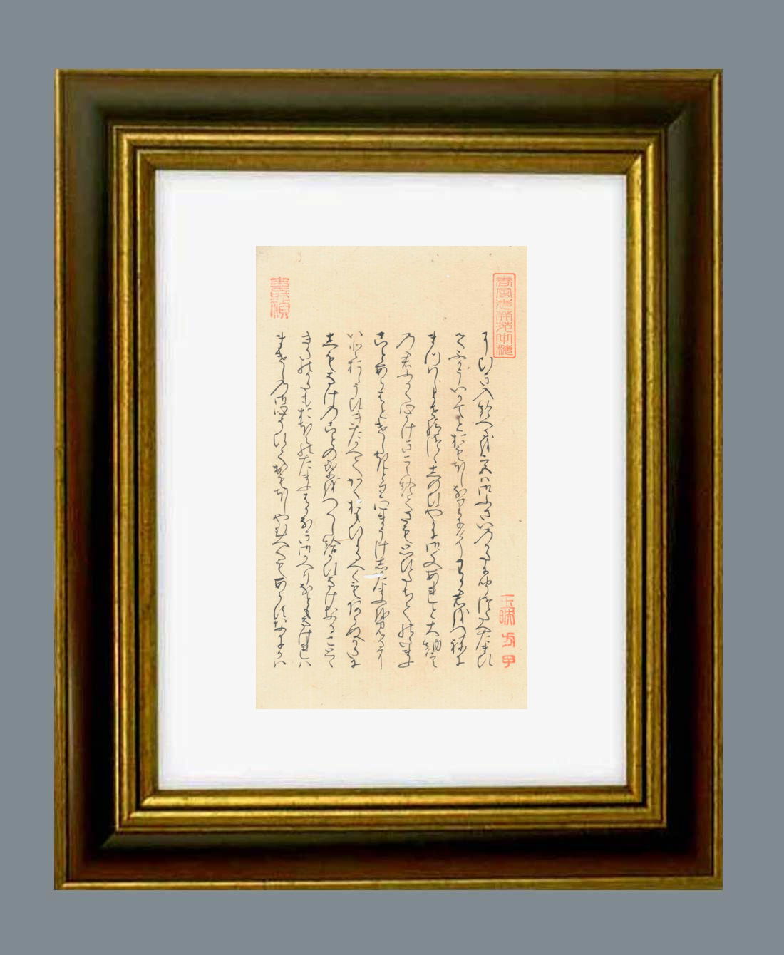 「源氏物語」自筆の大きさ タテ21.8センチ ヨコ12.8センチ。額縁の大きさは タテ37.0センチ ヨコ28.0センチです。額縁は新品です。 |
