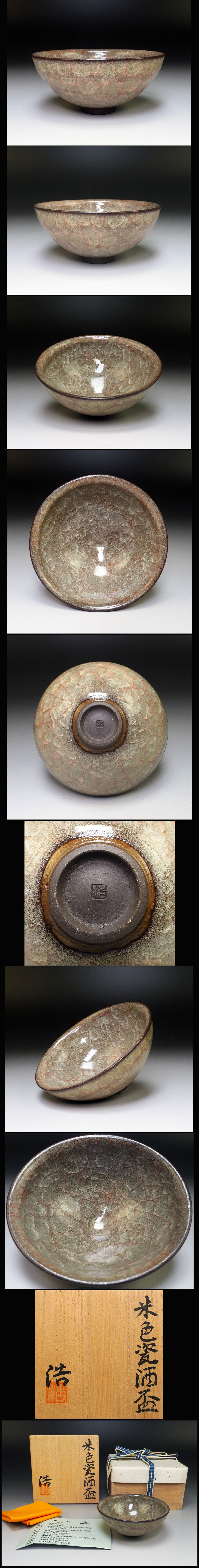 ![]() 小林浩の貫入が綺麗に表現された「米色瓷酒盃」です。 サイズ:約 径 9.0cm 高 4.0cm 共箱・布・栞付 作品状態:無傷で美品です。(目視確認です。) こちらの作品は真作保証の安心頂ける作品であることをお約束いたします。 不明な点は、入札前に質問等でご確認下さい。 小林浩 1953年 茨城県に生まれる。 1979年 国立工業技術院、名古屋工業技術試験所にて釉薬の研究。 1989年 笠間市大渕に築窯。 1990年 青磁の制作を始める。 1991年 第11回日本陶芸展 入選。 1995年 第35回伝統工芸新作展 入選。 1998年 北関東陶芸展 奨励賞受賞。 2007年 第54回日本伝統工芸展 入選。 2012年 茨城県芸術祭美術展 板谷波山賞受賞。 2017年 第2回上海国際陶瓷展 特別賞受賞。 | |||