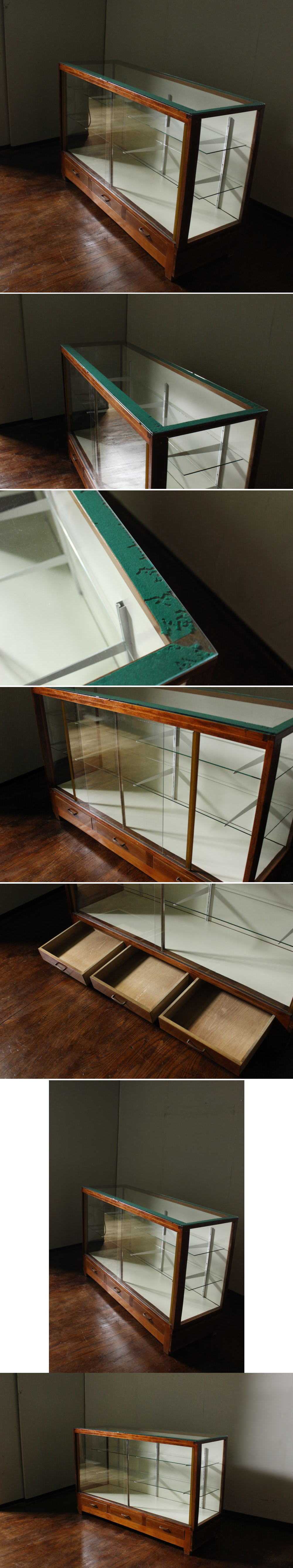古くからある町の雑貨屋さんで長く使われていた品です。 使いこまれた古色の風合いがとても素敵です。 後年にリペアし使用していたようで、底や背面にメラミン板、 引戸はシンプルなガラス製、棚は高さ調整が出来るようされています。 下部に三杯の引出し付きでちょっとした収納に重宝です。 店舗のショーケースとしても良い雰囲気を演出してくれる事でしょう。 |
