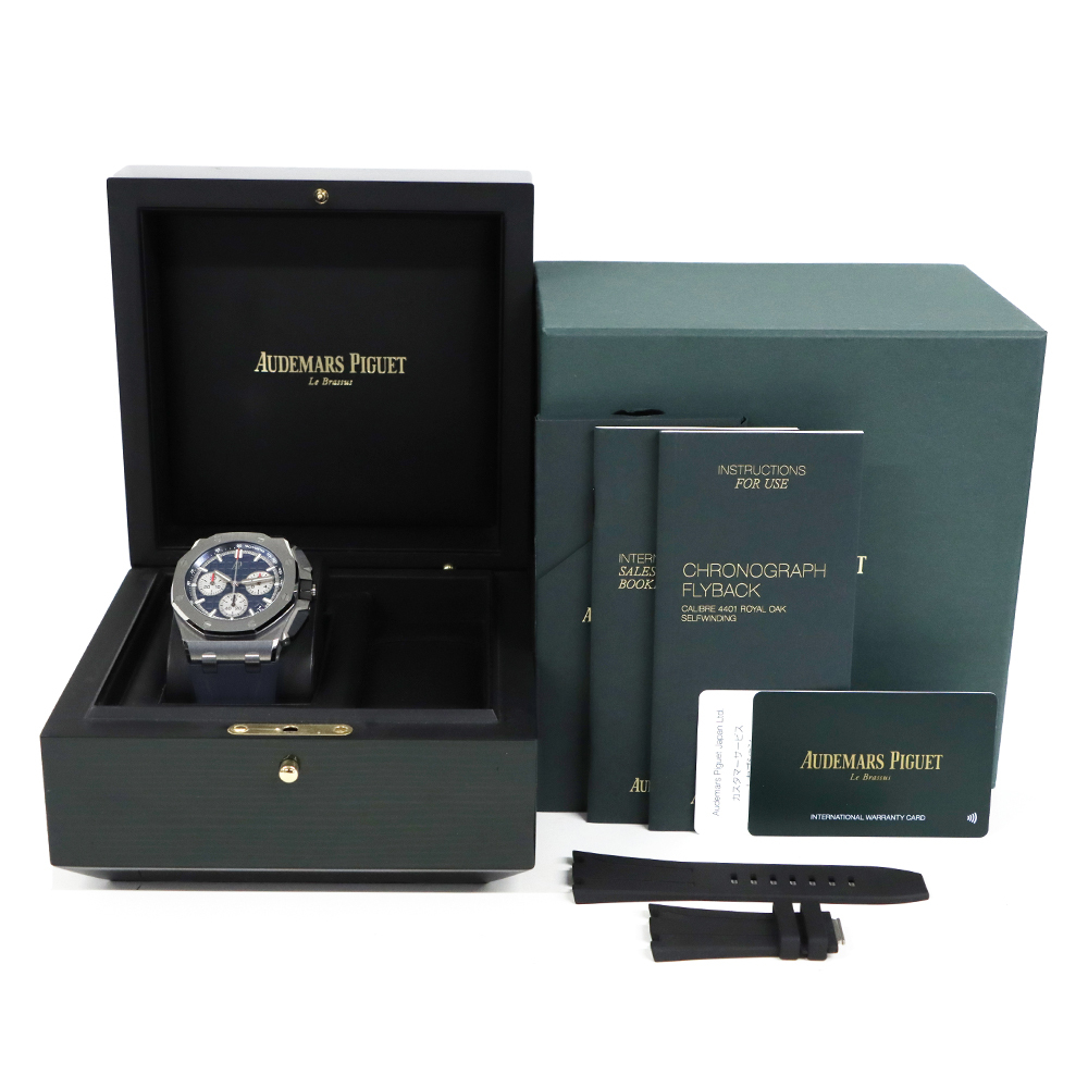 こちらはオーデマピゲ ロイヤルオーク オフショア クロノグラフです。素材にチタンを使用したケースサイズ43mmの新デザインモデル。洗練されたブルーのメガタペストリーダイヤルが落ち着いた印象を与えてくれるでしょう。ムーブメントはCODE 11.59でも使用されているフライバッククロノグラフキャリバー4401を搭載しており、特徴である22Kピンクゴールドの回転錘や、コート・ド・ジュネーブ、ライン仕上げ、サーキュラーグレインなどの洗練された仕上げの部品を、サファイアケースバックを通して見ることができます。そして新たに設計されたストラップは簡単にお客様ご自身で交換が可能なシステムとなっており、ご気分に合わせてお楽しみいただけるでしょう。新たに誕生したロイヤルオーク オフショアはより実用性に特化した素晴らしい仕上がりとなっております。