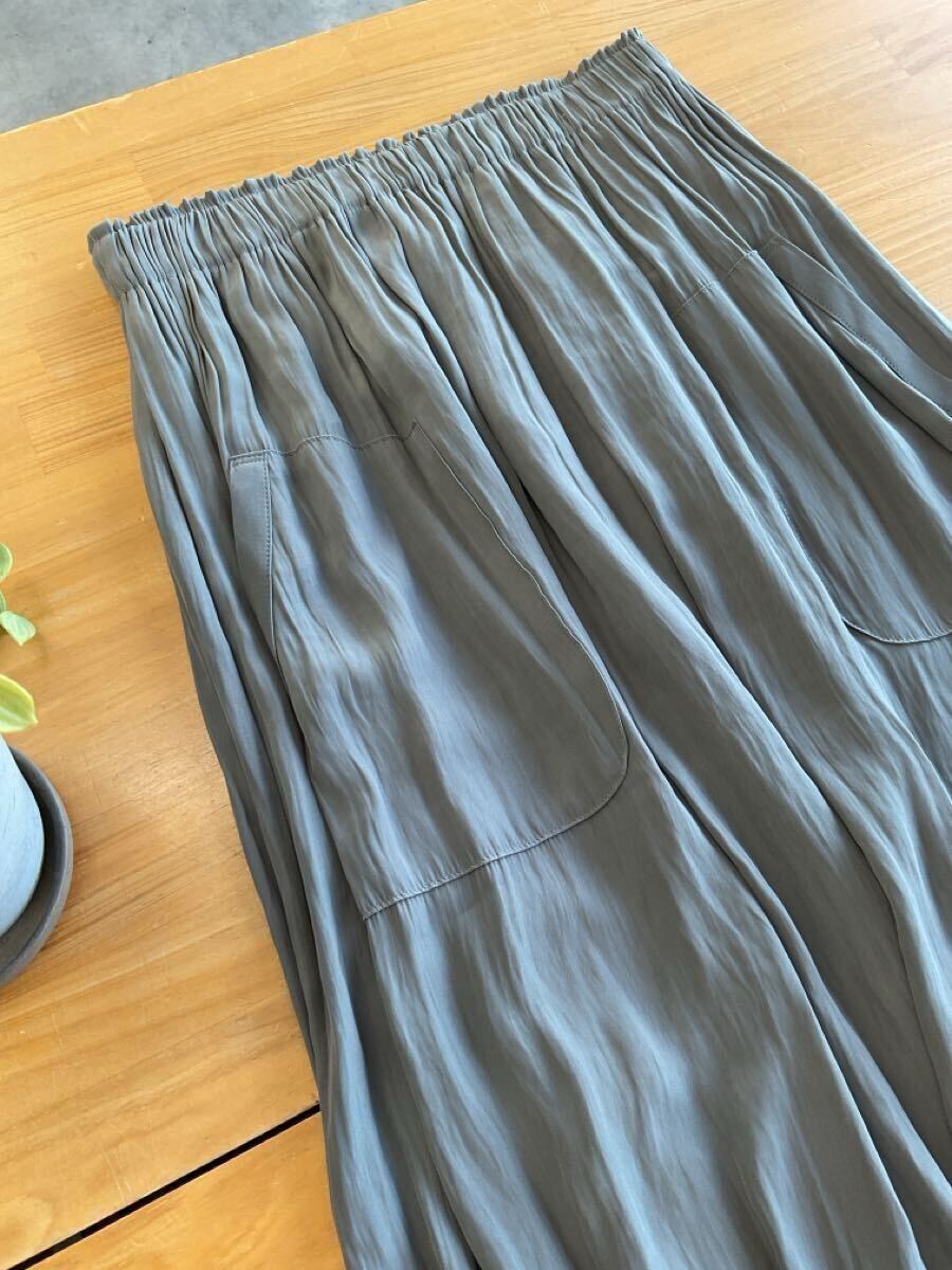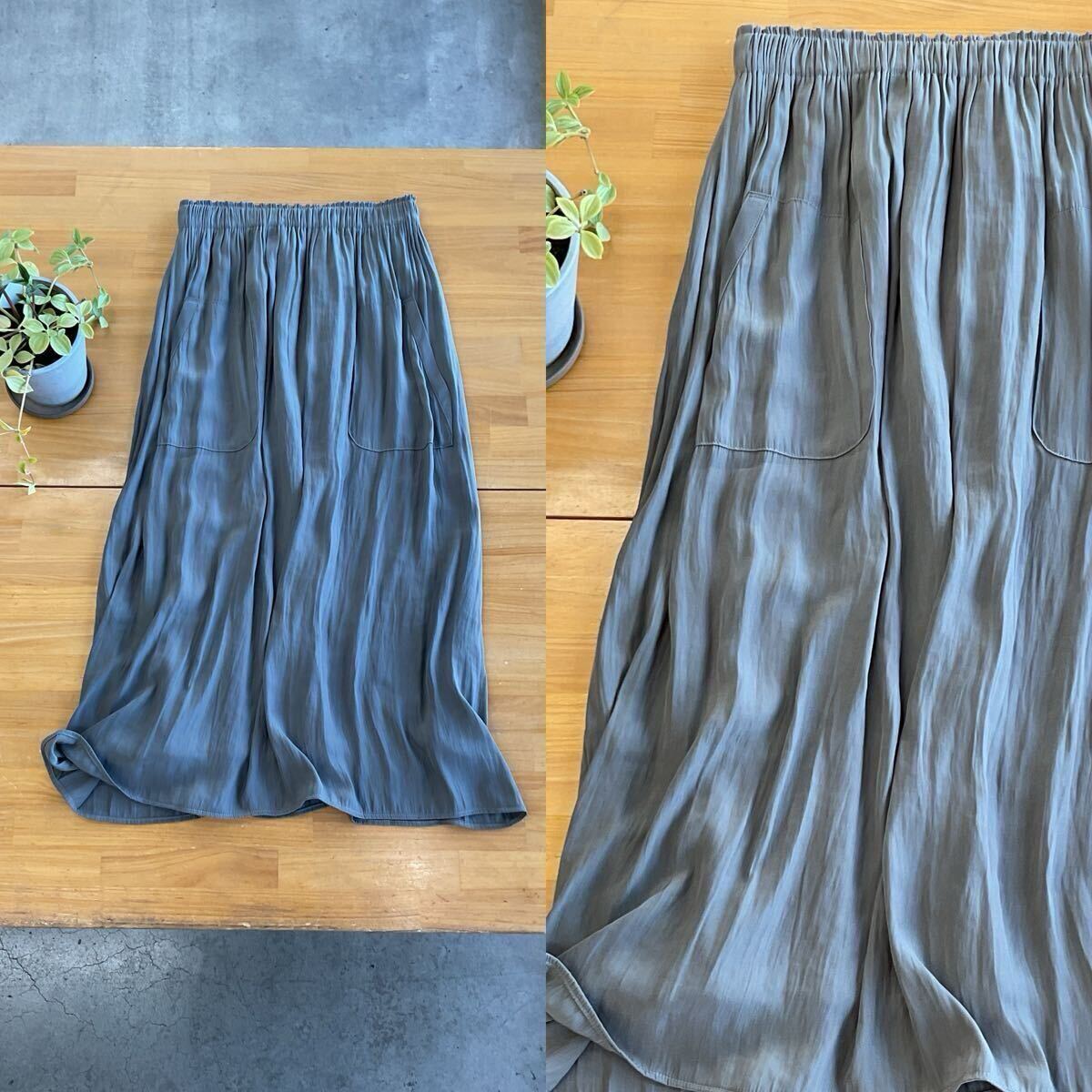 美品 fou foret フーフォレー ポケットデザインとろみスカート 光沢ウエストゴム縦ラインギャザーボトムス カジュアル カーキ深緑色系 38 h 收藏