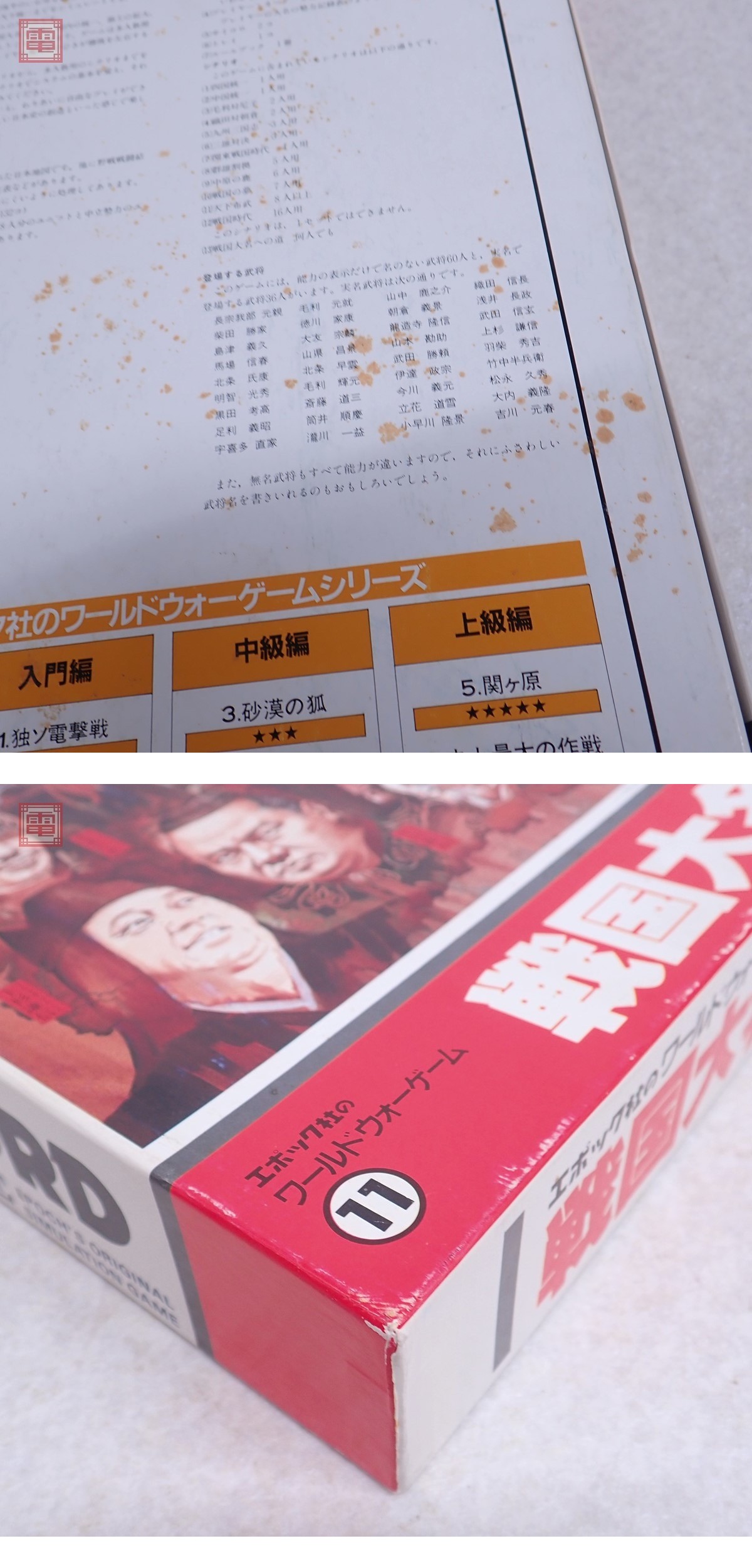 ボードゲーム 戦国大名 エポック社 ワールドウォーゲーム 現状品 ■こちらの商品は【現状品】のため、どの様な不具合が生じましても当店では交換・返金・返品等の対応はできません。 ■ご理解ご納得いただける方のみご入札をお願いいたします。 ■外箱にスレ、キズ、汚れ、シミがあります。 ■パーツにスレ、キズがあります。 ■内容物、パーツ未チェックの為、欠品の可能性があります。 ■写真のものが全てです。付属物の有無や状態については写真からご判断ください。 ■付属物については細かいチェックはしておりませんので、万が一、欠品があったり余計な物が入っていたとしてもご了承ください。 ■商品到着後、当店の保証期間中は、商品及び箱や取説、付属品などを1つでも廃棄や破損をしないようにお願い致します。廃棄や破損をした場合、商品に問題があった場合でも対応や返金などの対処ができなくなります。 ■商品によりますが、発売されてから10年以上経過している中古品である事をご理解頂いた上でご入札をお願い致します。なお、新品や美品、また特記事項がある場合は別途明記します。 | |||