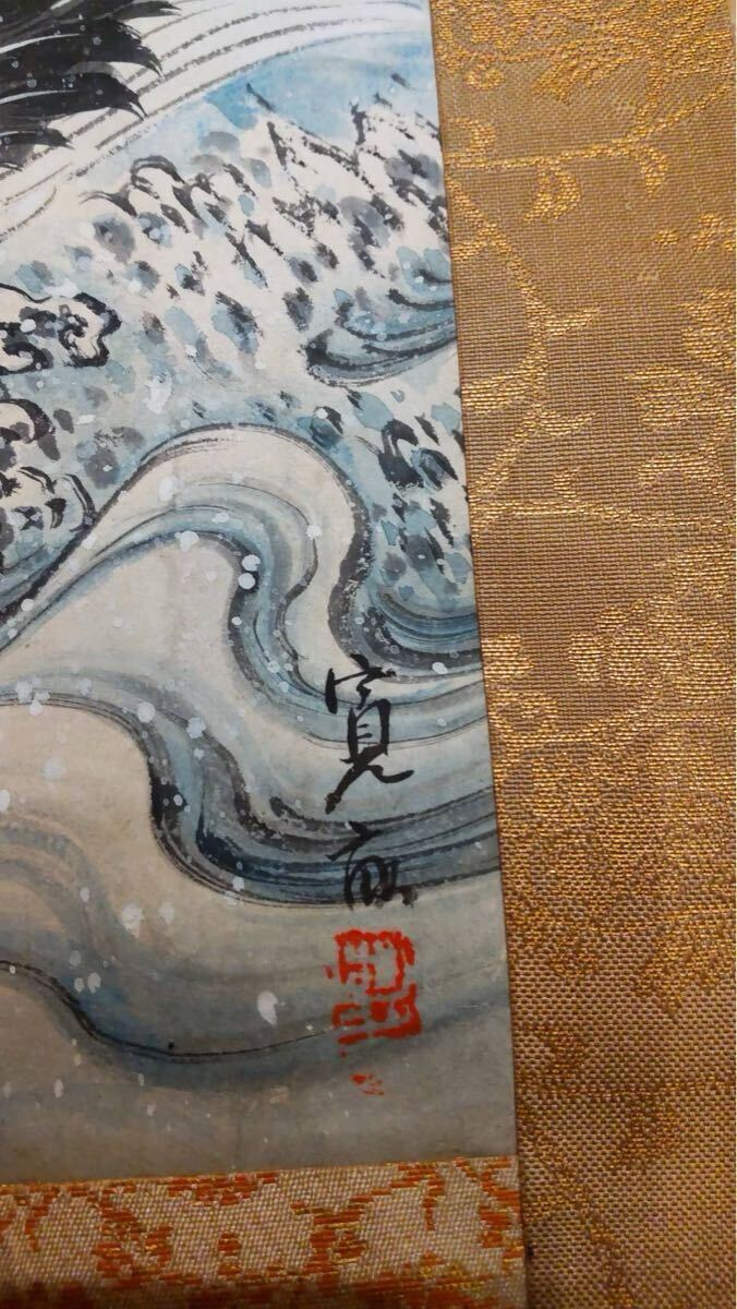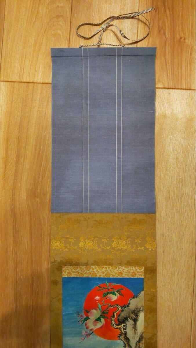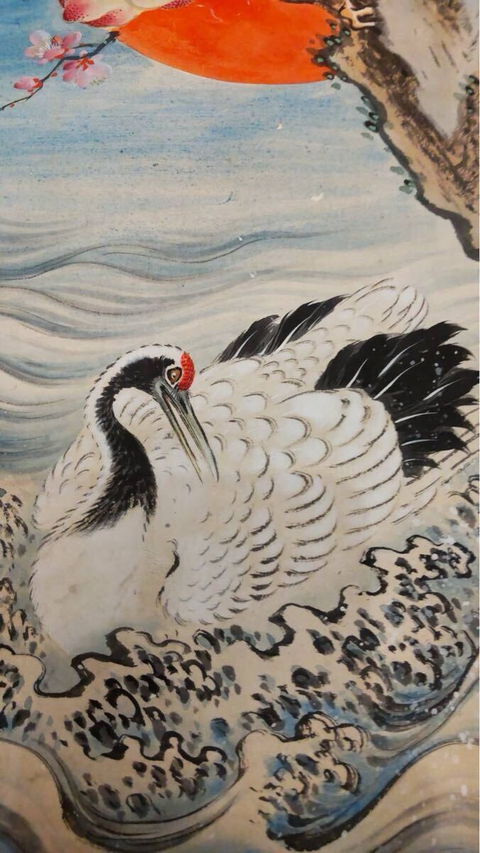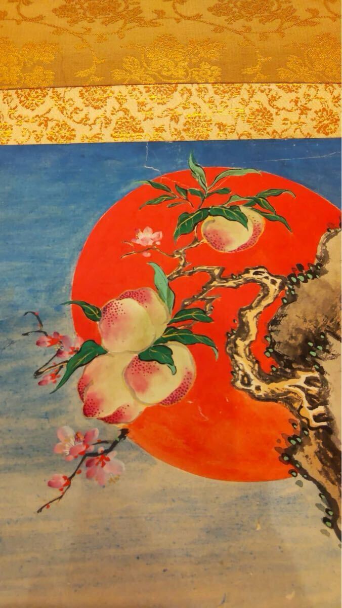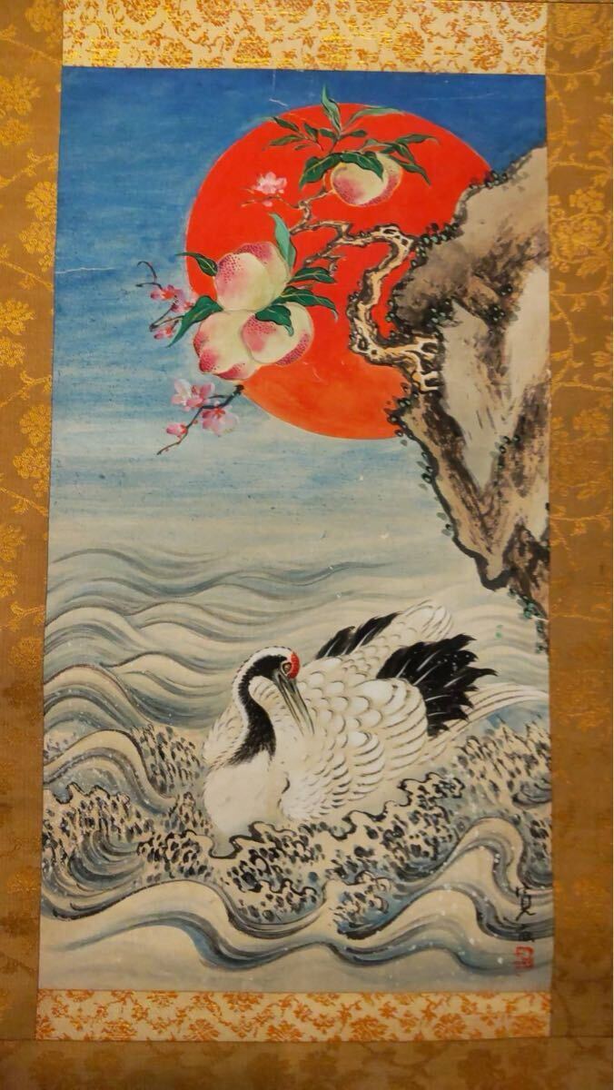 【真作★肉筆★極彩色な名品】荒木寛畝「桃鶴波図」掛軸 宮内省御用絵師 明治美術界の重鎮 検索:太陽/日の丸/佐賀/ 收藏